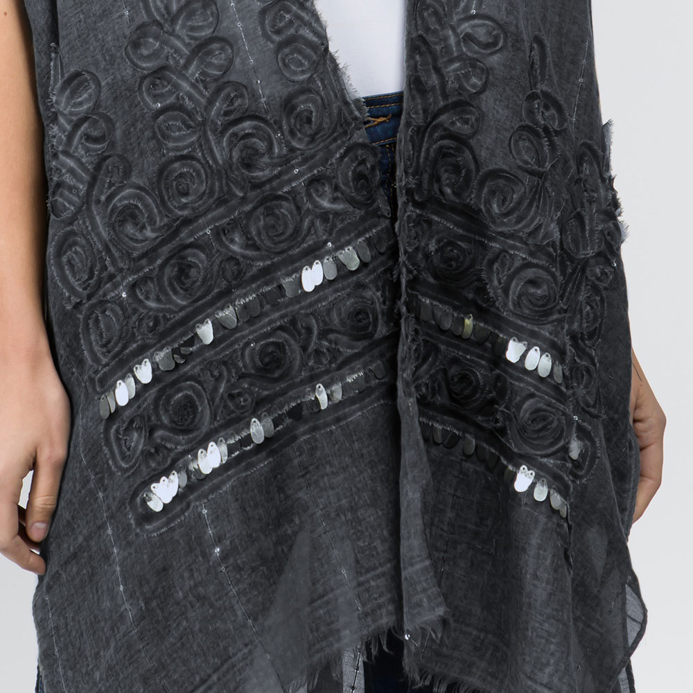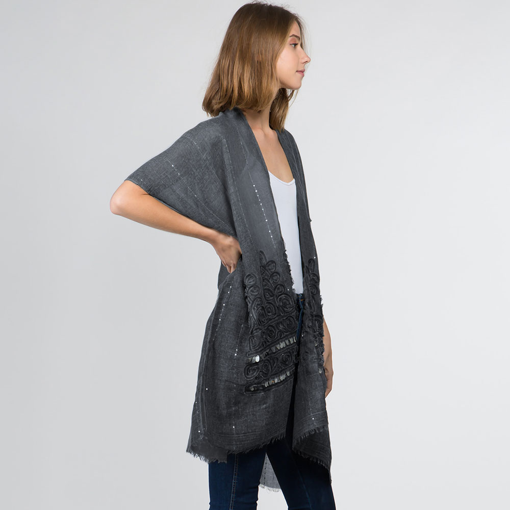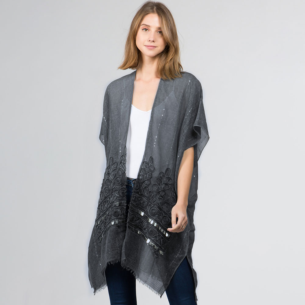 • Add texture and elegance to your look with this embroidered kimono. Its flowing silhouette and detailed accents make it a chic layering piece for casual outings or dressed-up occasions.