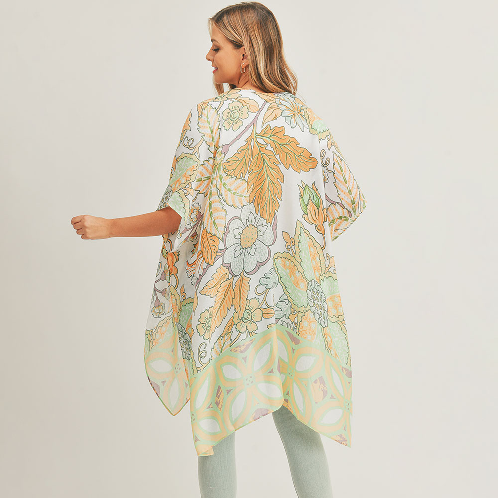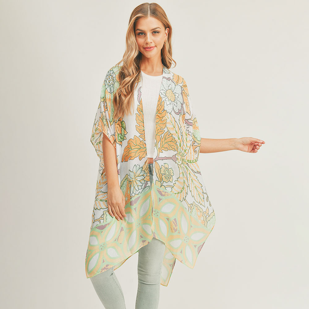 • Breezy floral poncho with soft, flowy silhouette and open front design. Ideal for layering over casual outfits, offering a touch of bohemian charm and relaxed sophistication.