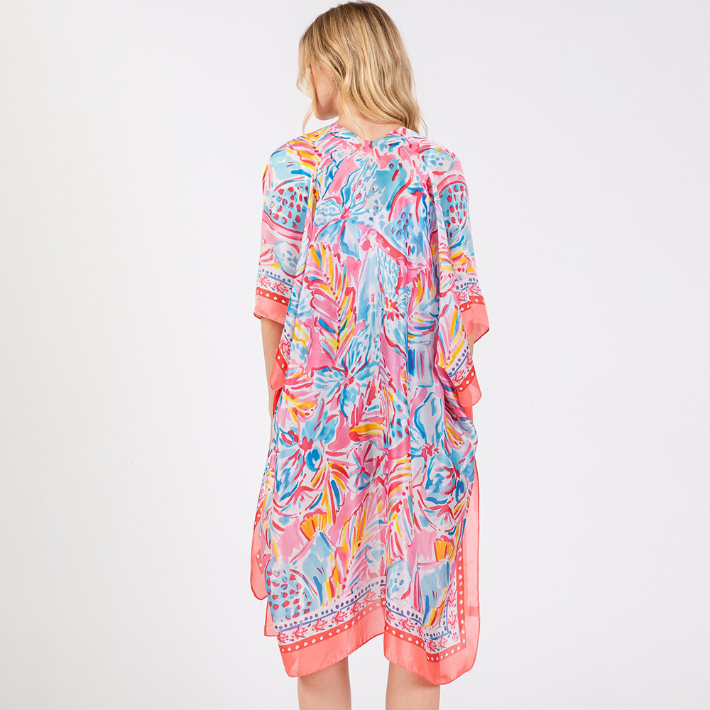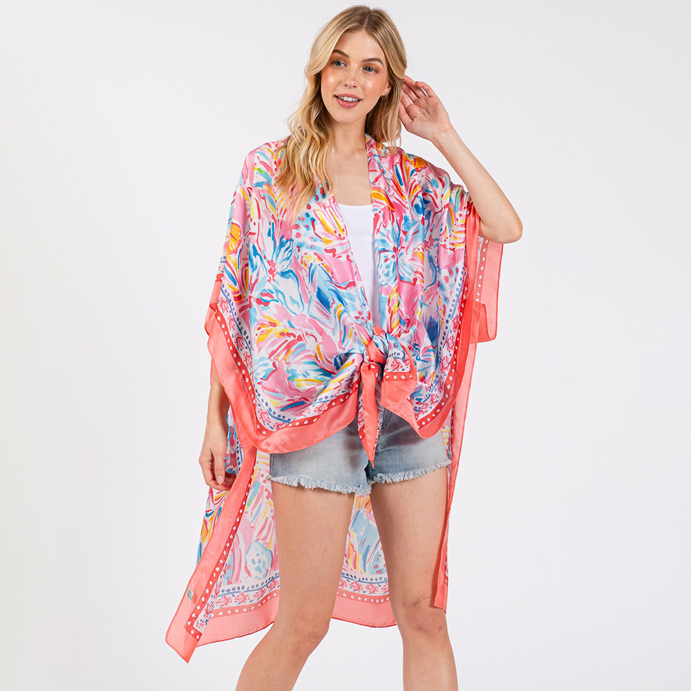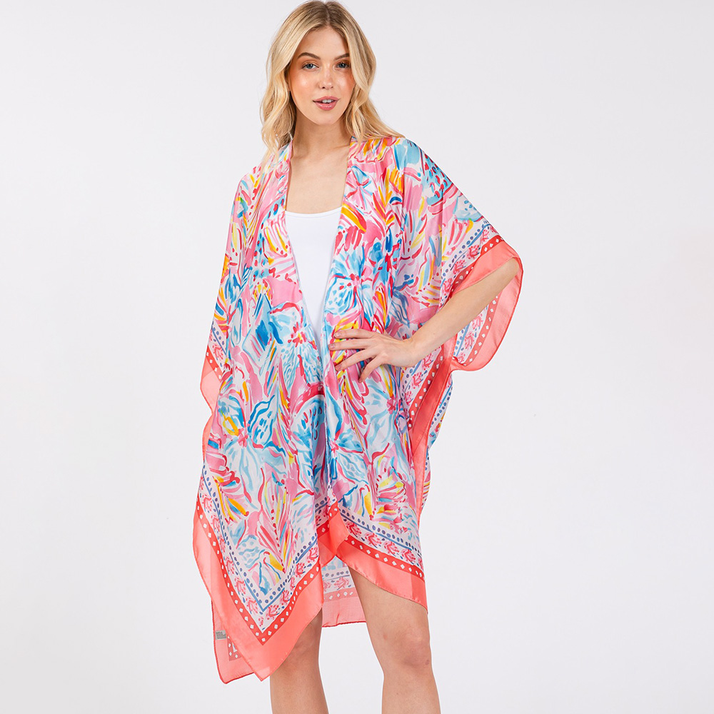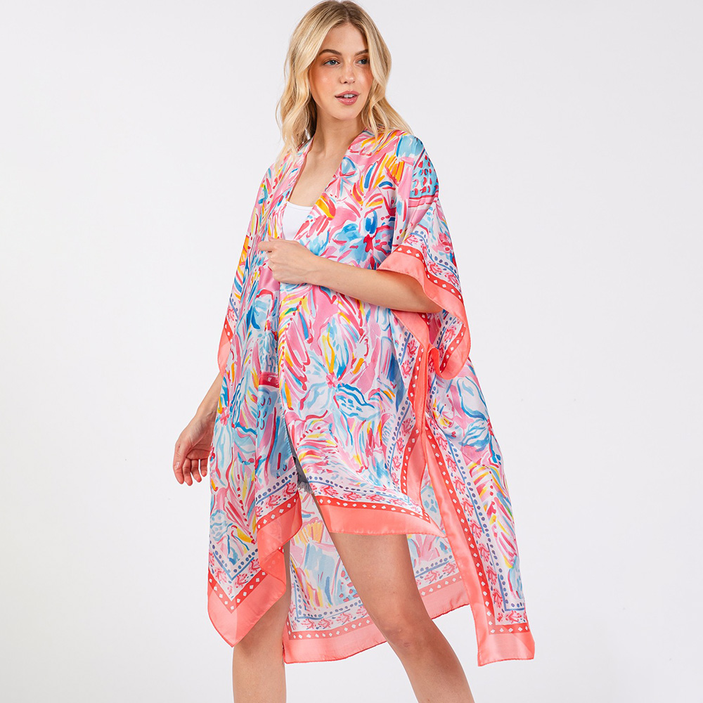 Boho Vibrant Floral Open Front Long Kimono Poncho