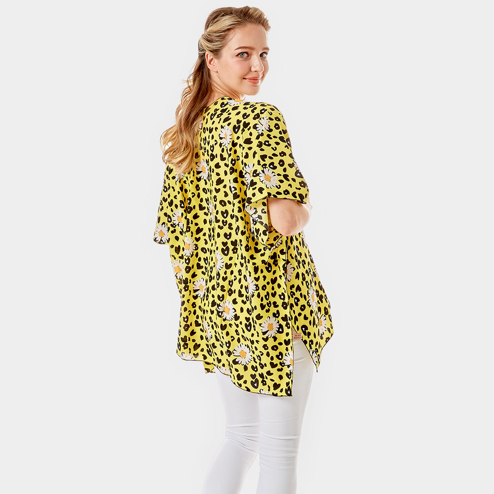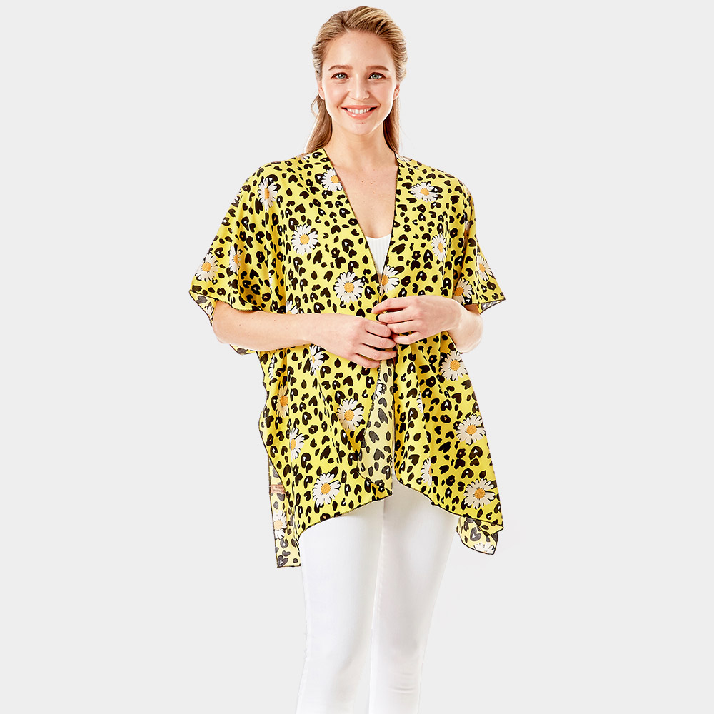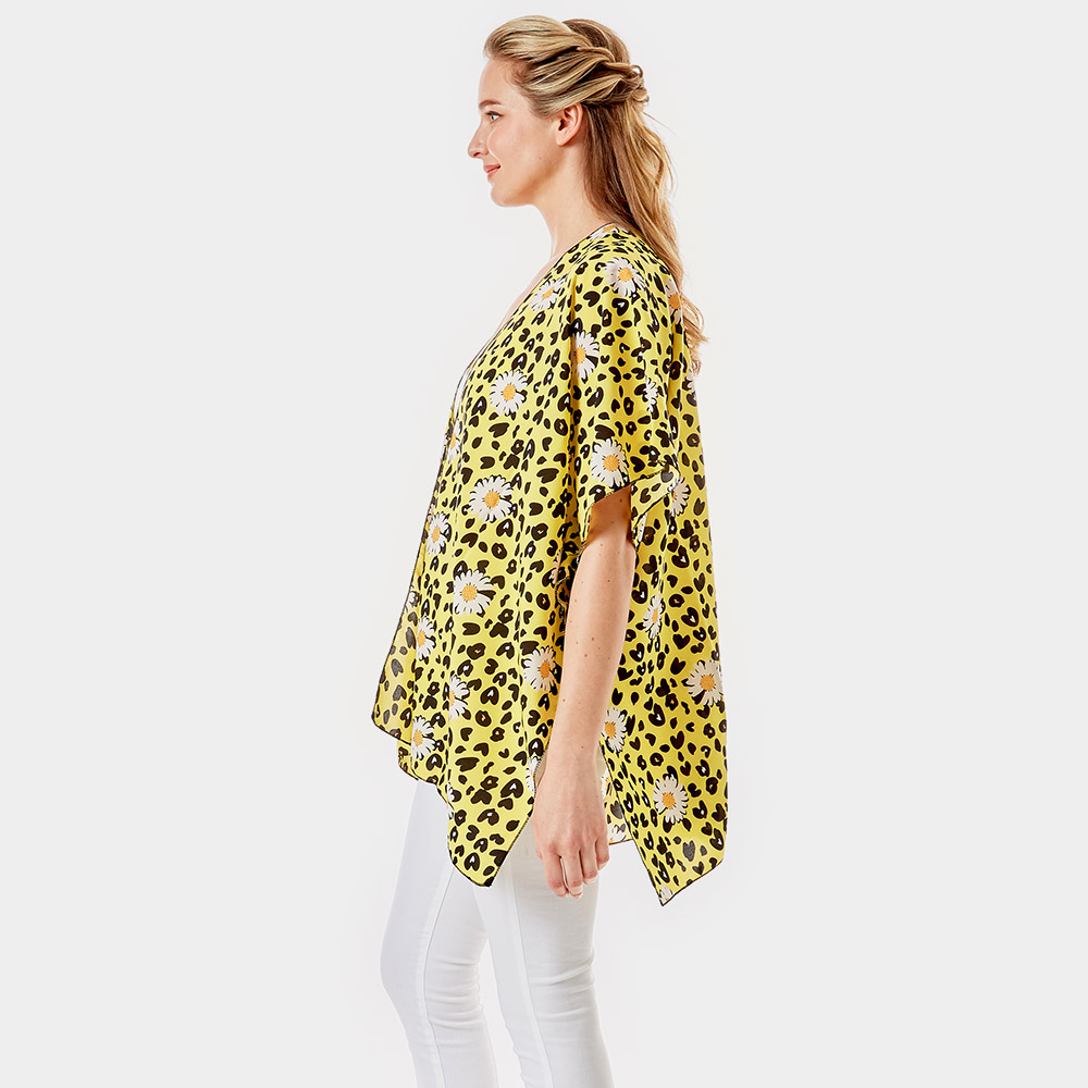 Leopard Pattern Daisy Flower Print Cover Up Kimono Poncho