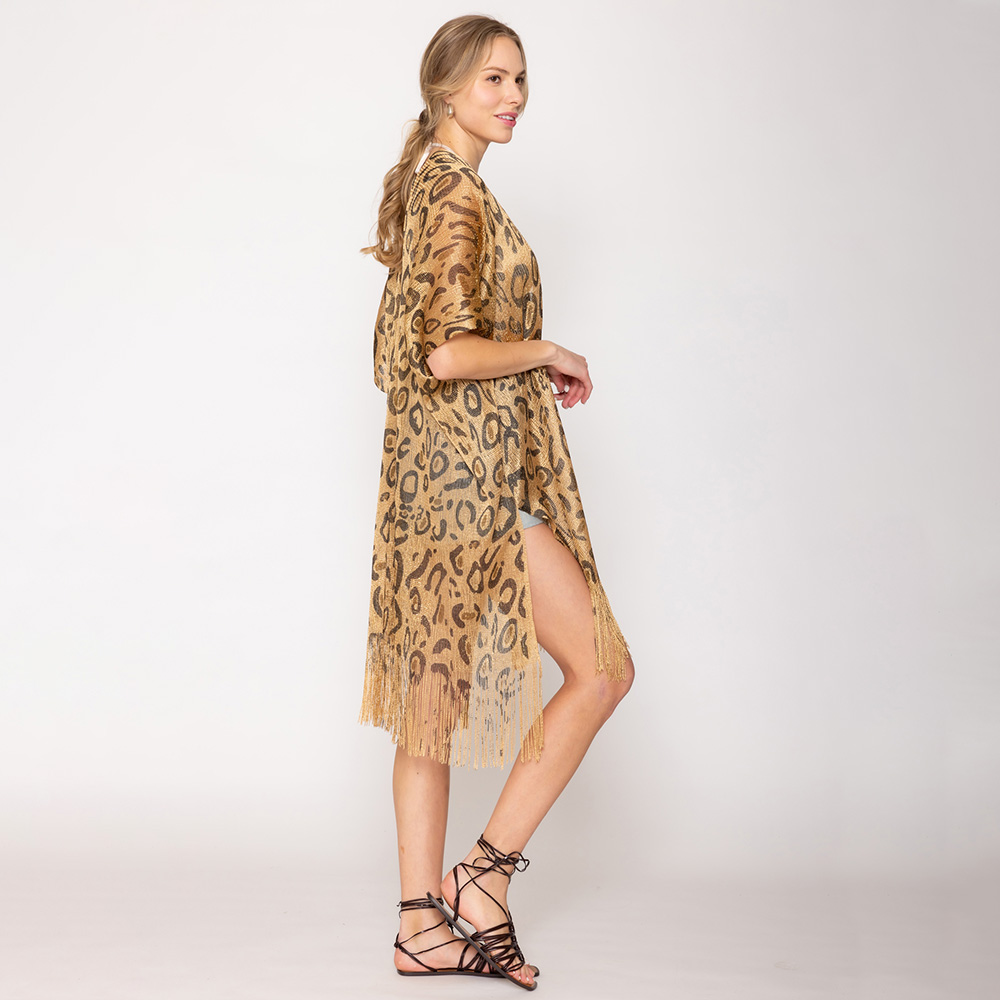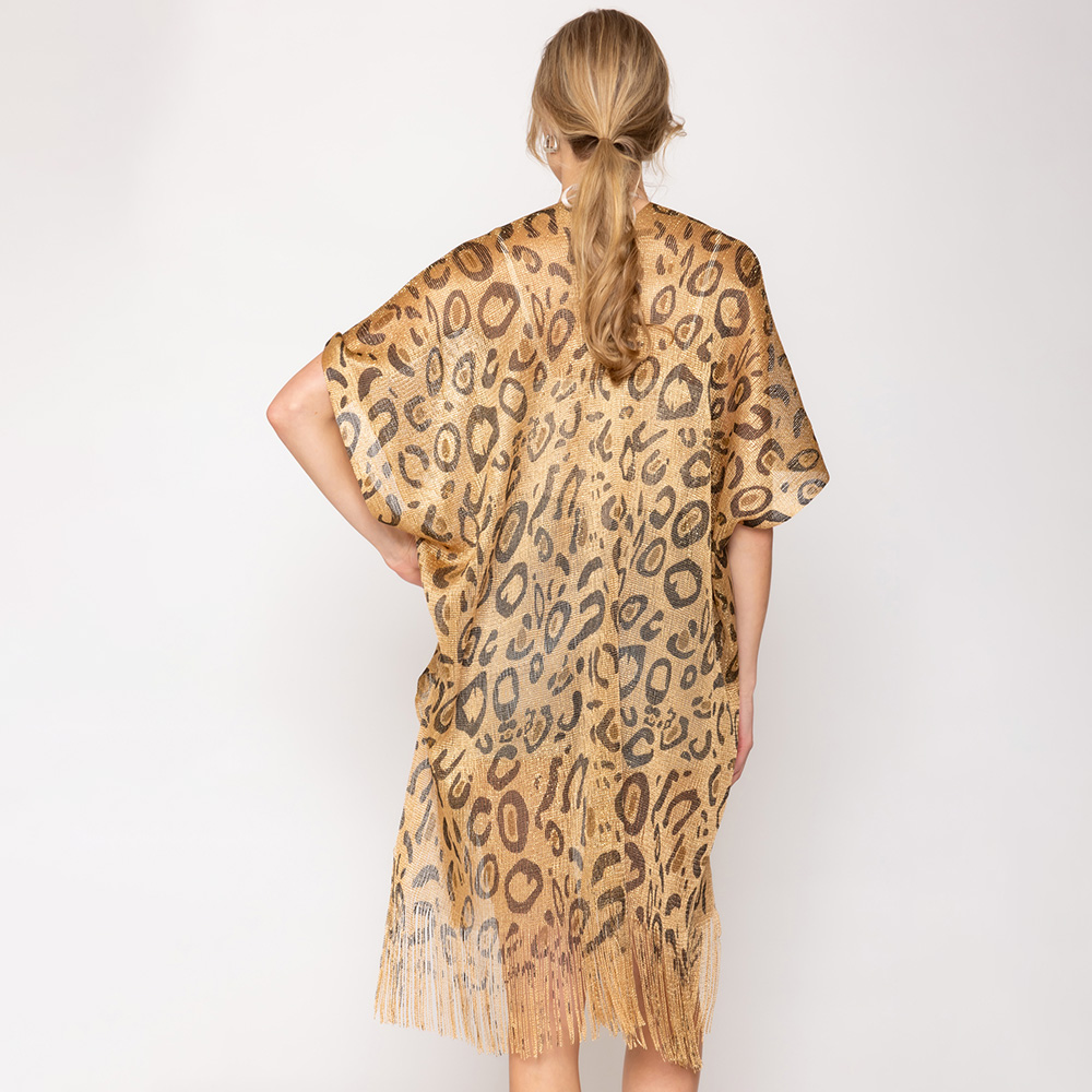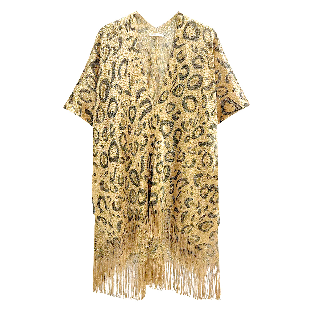 Leopard Pattern Printed Lurex Tassel Bottom Hem Kimono Poncho