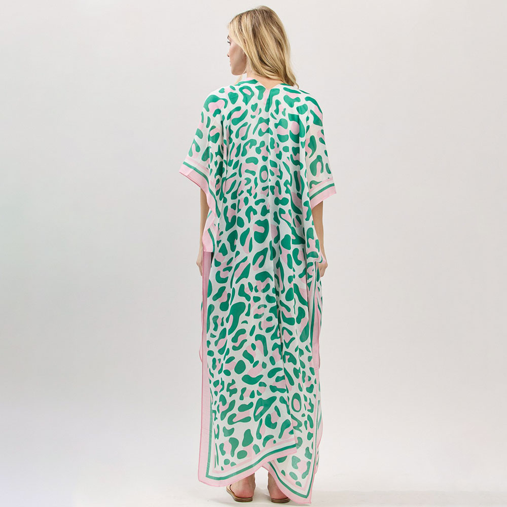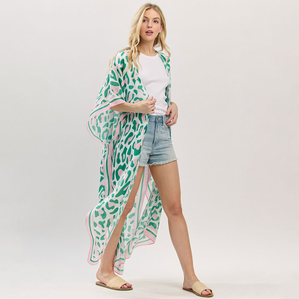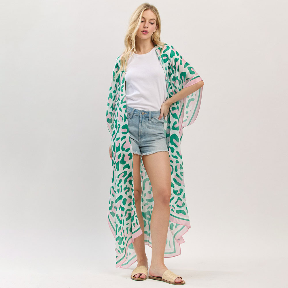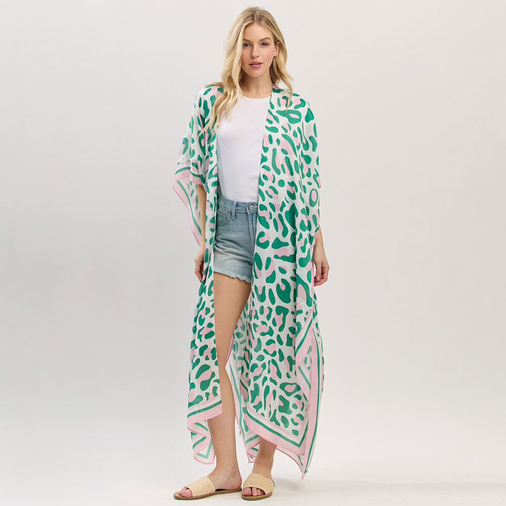 Details • Size : 35" X 47.5" • Material : 100% Polyester • Breezy and elegant long kimono with an abstract pattern and contrast trim. Perfect as a stylish layering piece for casual wear or beach cover-up. Soft, lightweight fabric enhances comfort.