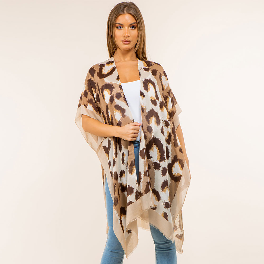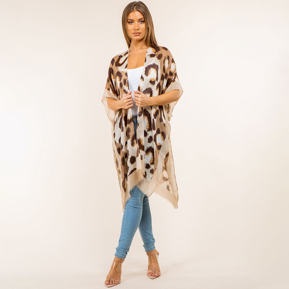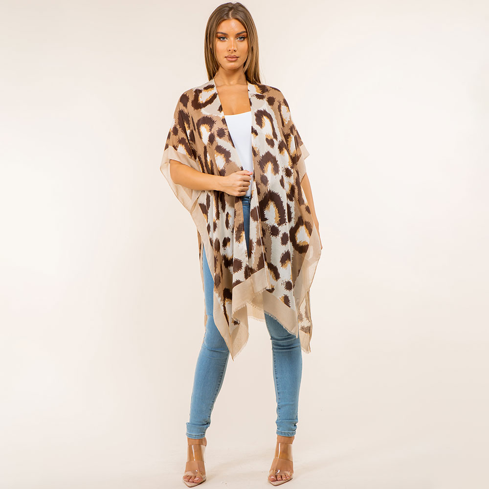 Leopard Print Open Front Fringe Hem Kimono Poncho