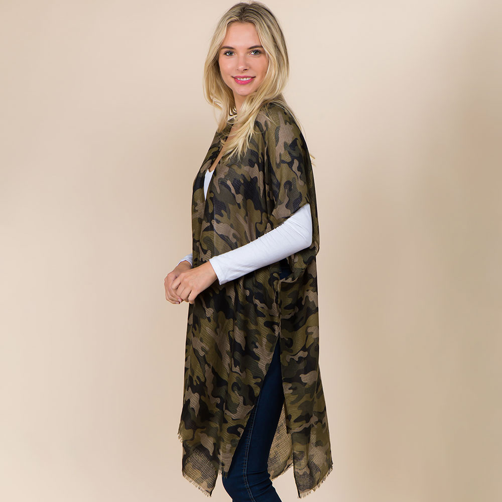 Details • Size : One Size • Material : 100% Polyester • Stay stylish with this camo print kimono wrap. Designed with a relaxed fit and open front, it adds a trendy touch to casual outfits. Perfect for layering over basics for an effortlessly cool and comfortable look all year round.