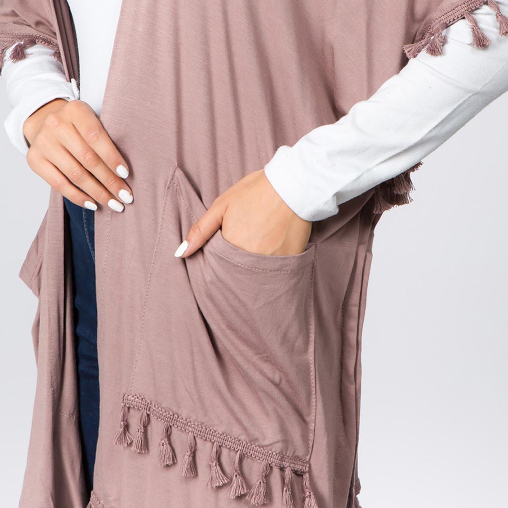 • Add a boho touch to your outfit with this lightweight open cardigan featuring tassel trim and front pockets. Perfect for layering, this relaxed fit cover-up offers effortless style and comfort for everyday wear.