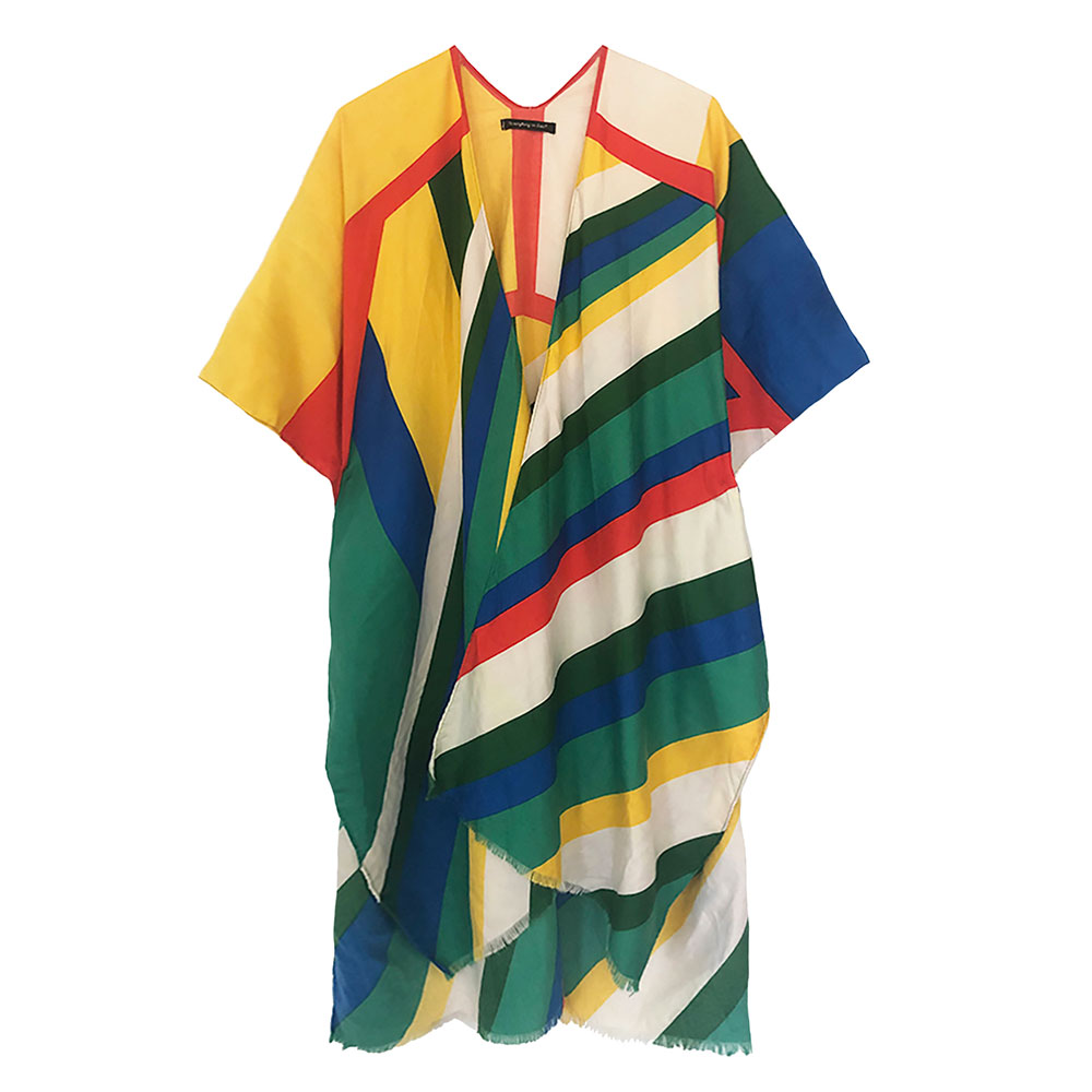 Details • Size : 35.4" X 35.4" • Material : 100% Polyester • Lightweight kimono wrap with bold abstract stripe design. Features open front and relaxed fit for effortless layering. A versatile statement piece that adds energy and flow to casual or elevated looks.