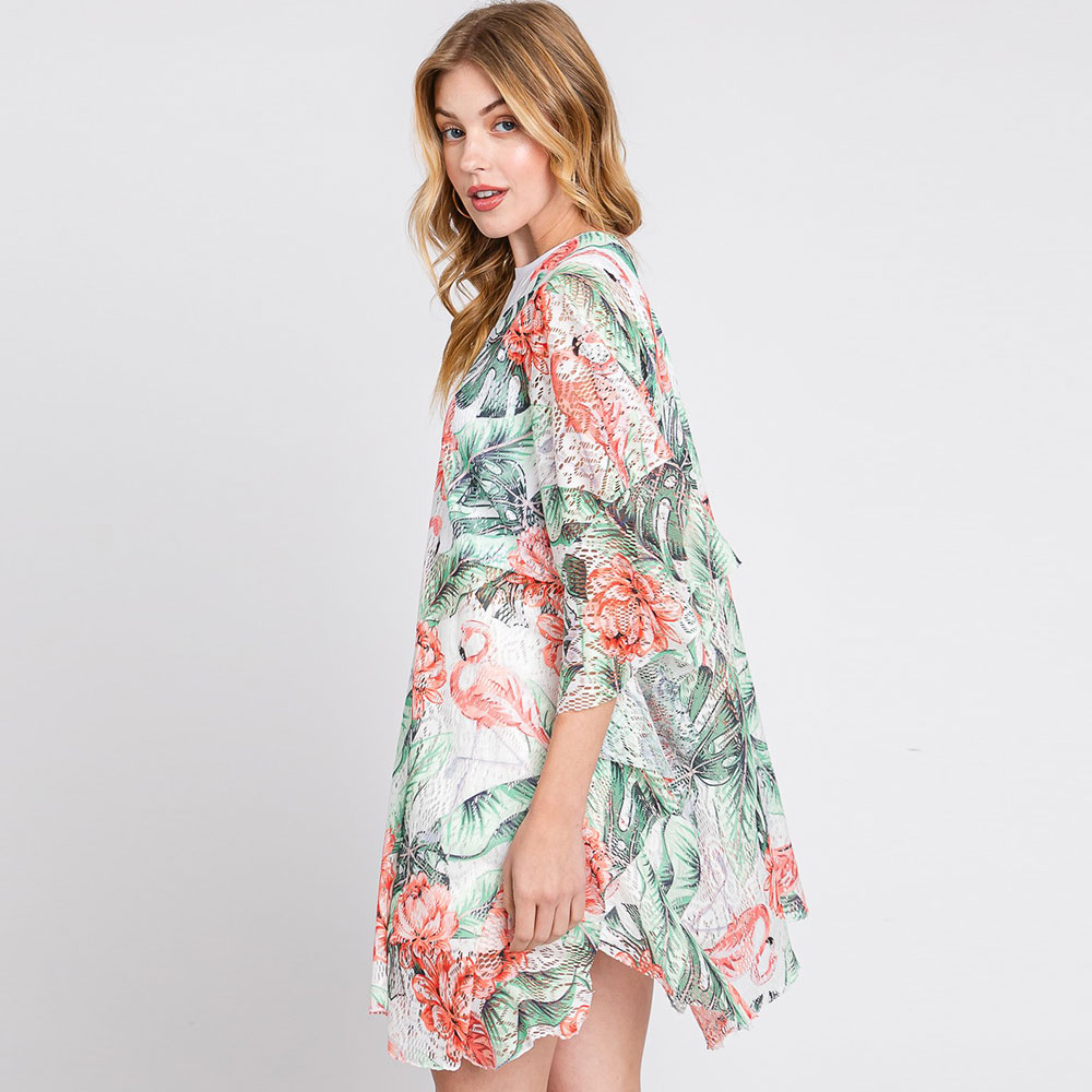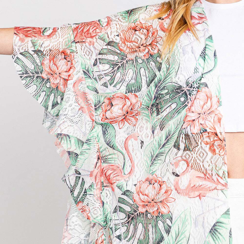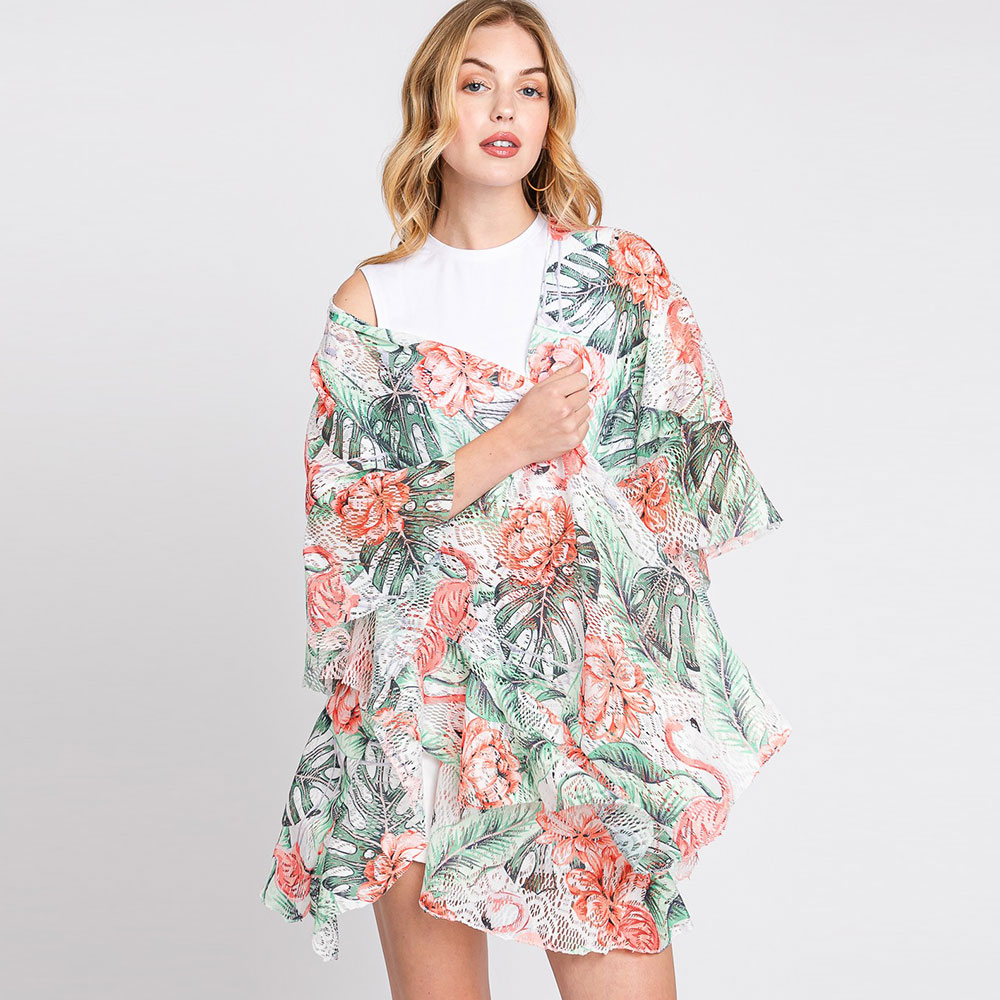 Ruffle Lined Flower Leaves Printed Open Front Crochet Cover-Up Kimono Poncho