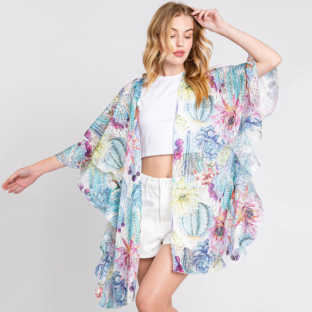 Ruffle Lined Flower Print Open Front Crochet Cover-Up Kimono Poncho