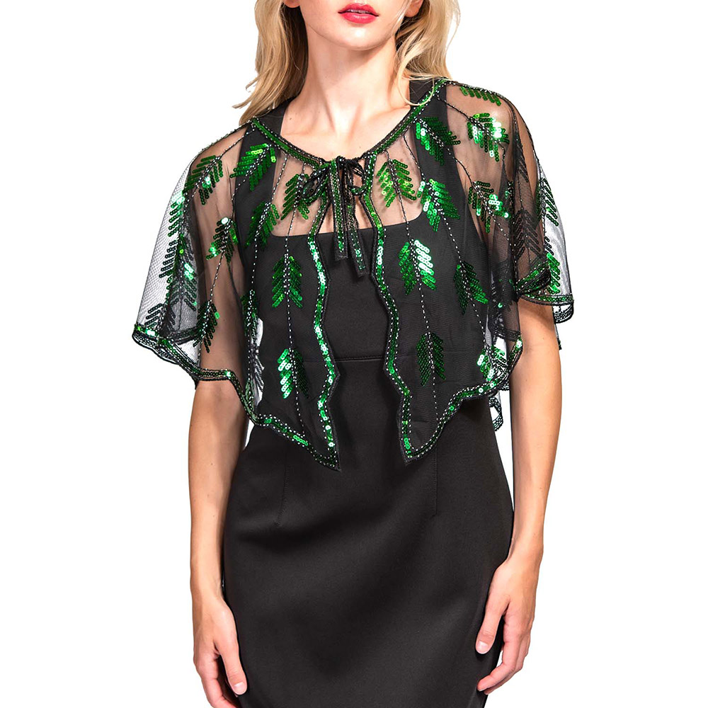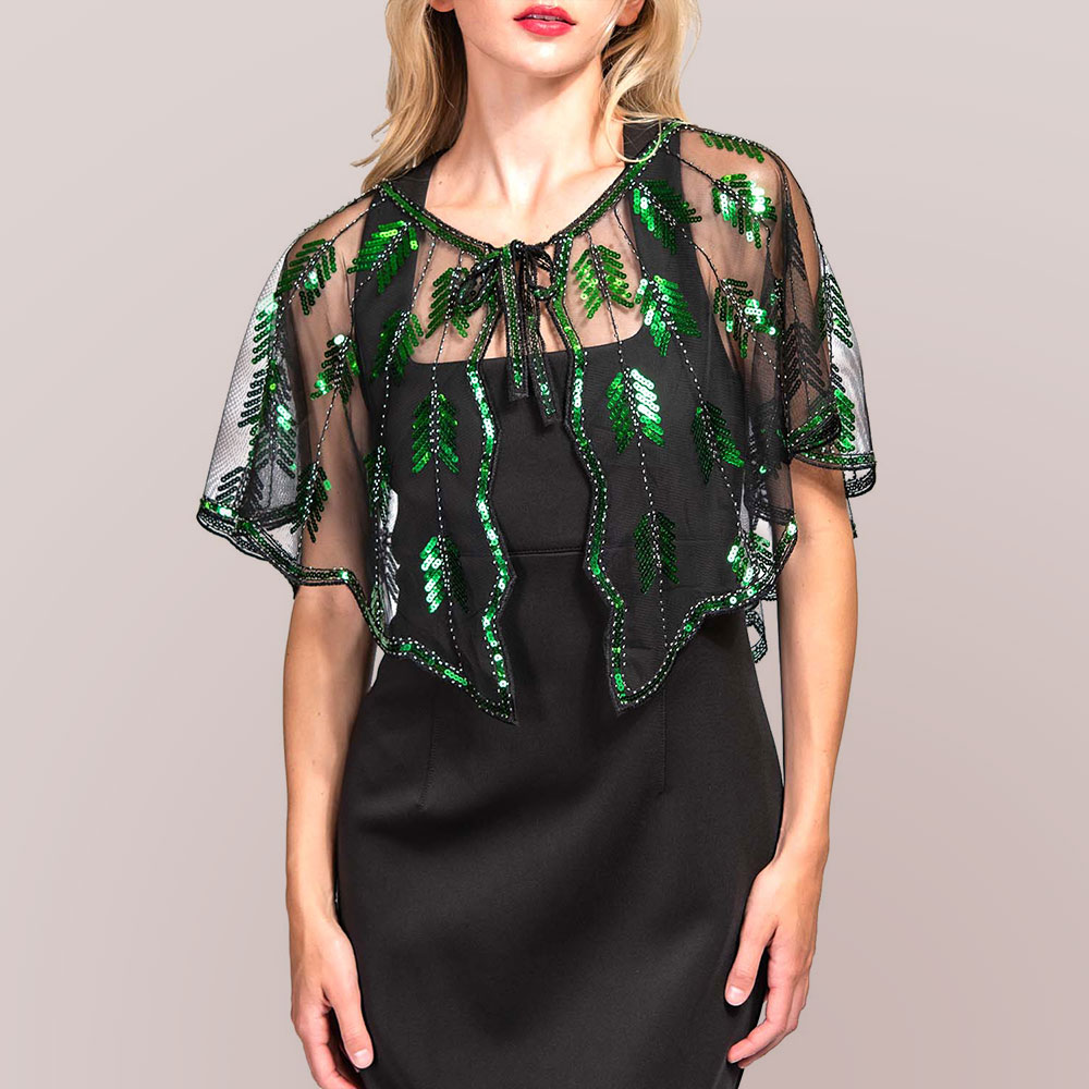 Sequin Bow Pointed Leaf Beaded Retro Style Sheer Shawl Cape Poncho