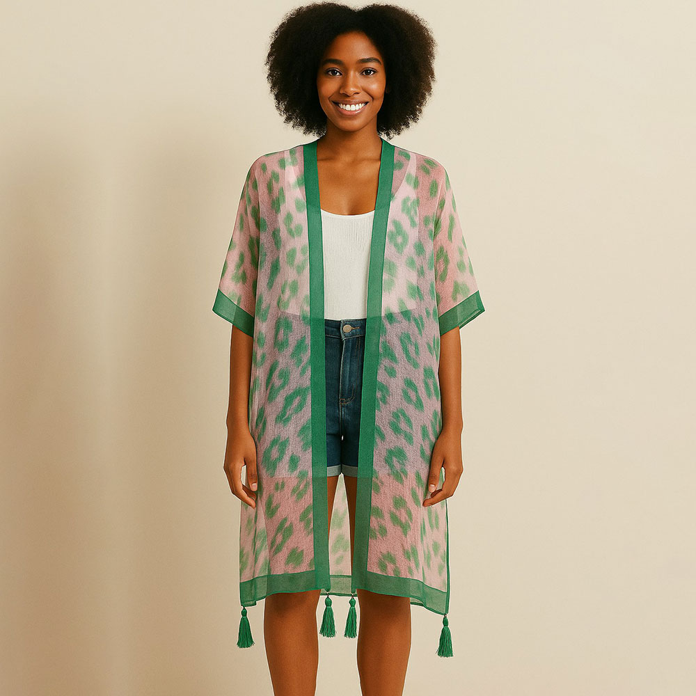 Sheer Leopard Print Tassel Detail Open Front Long Kimono Poncho