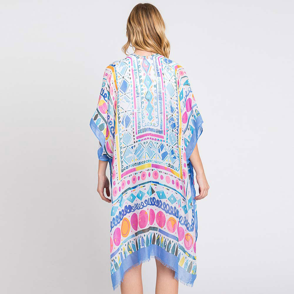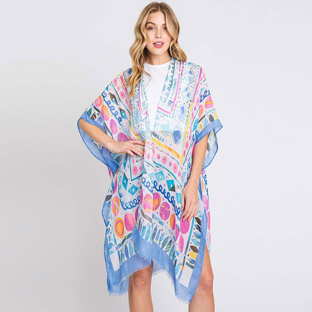 Watercolor Boho Geometric Print Kimono Poncho