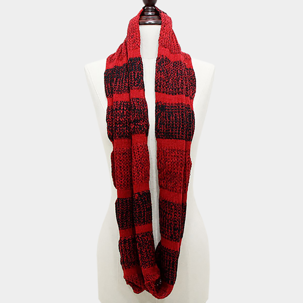• Stay warm and stylish with this chunky knit infinity scarf featuring a bold striped pattern. Its soft texture and looped design make it a versatile accessory, perfect for elevating your winter outfits with a cozy and modern touch.