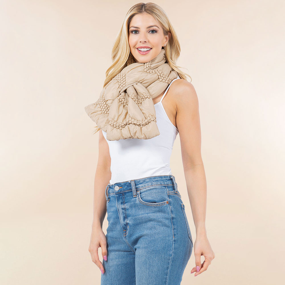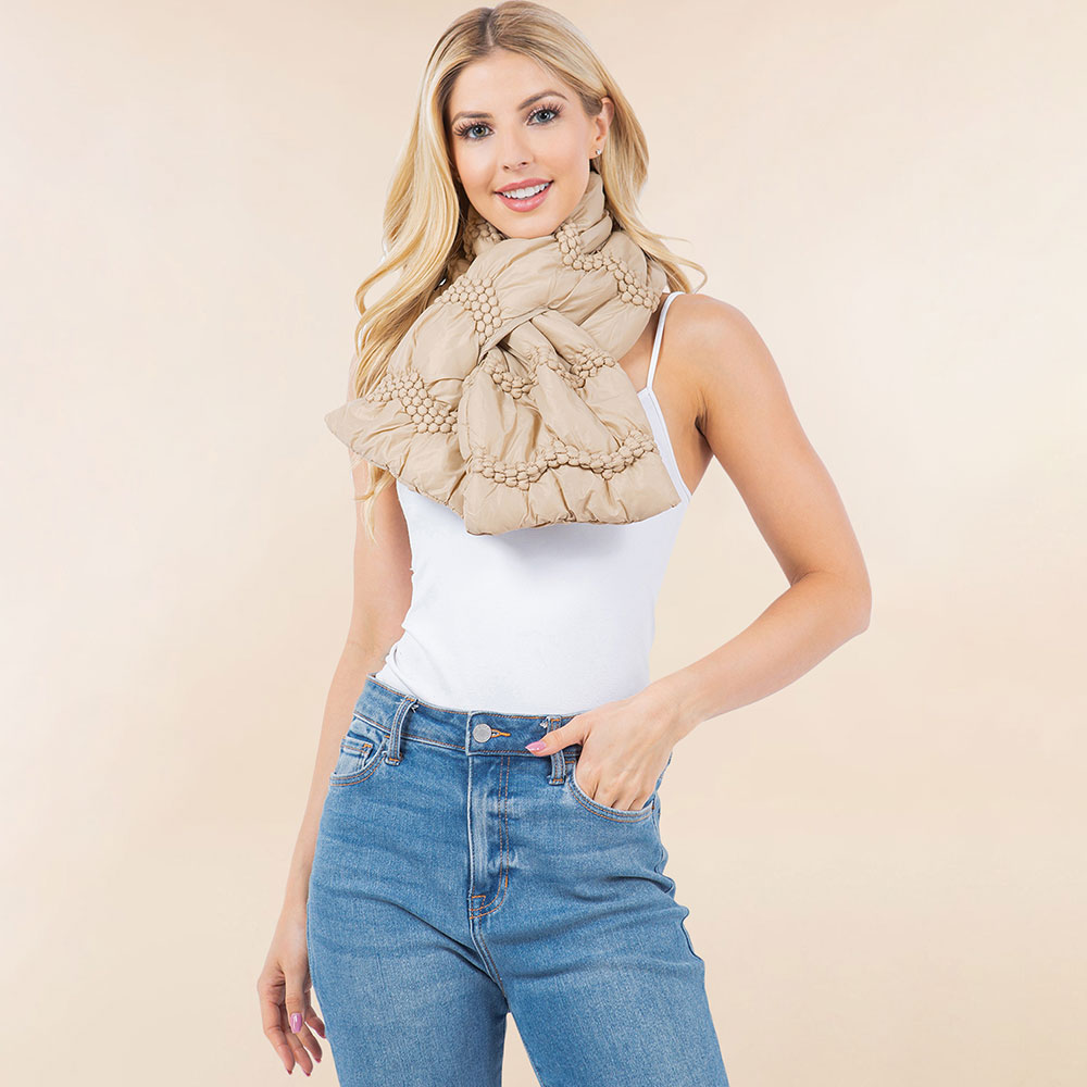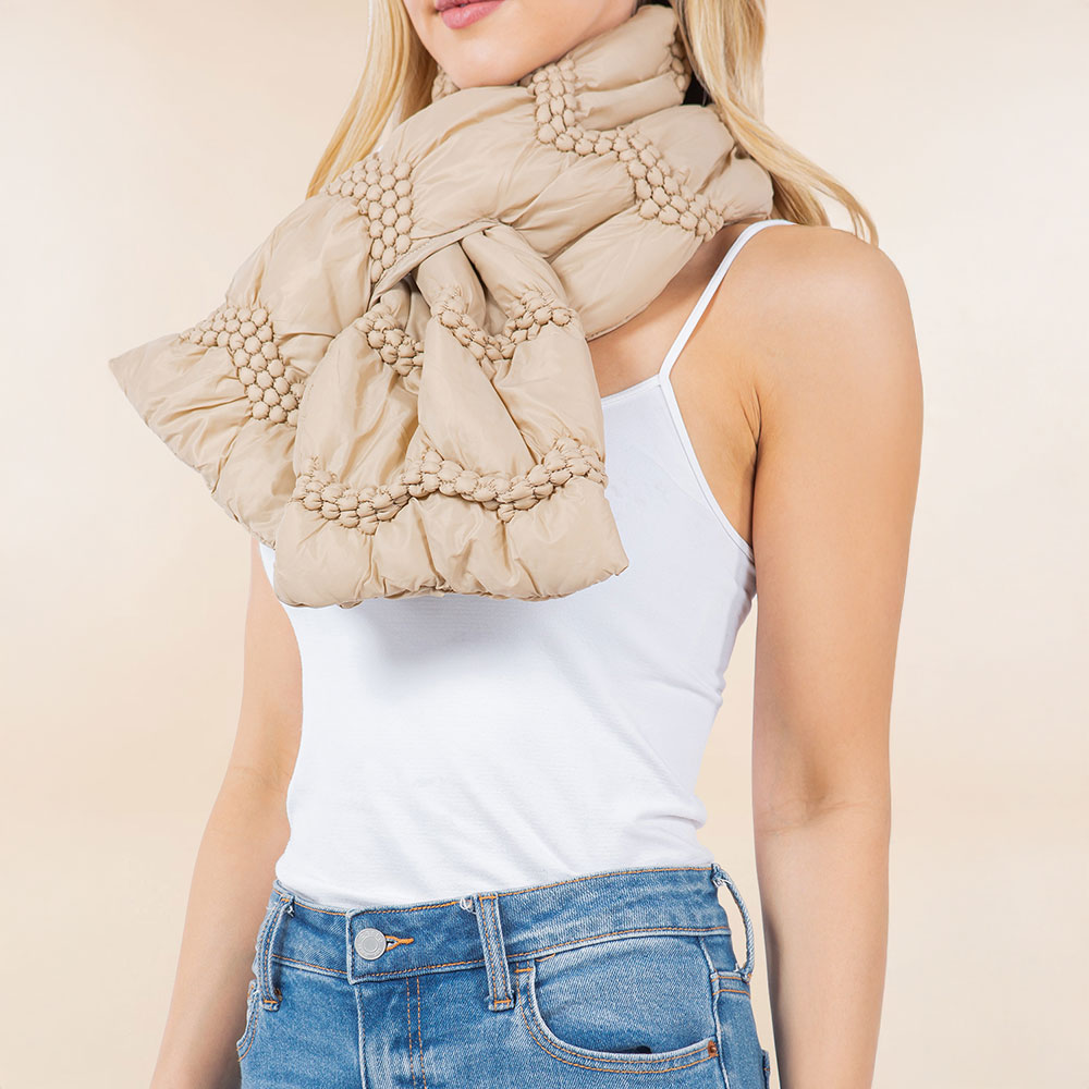 Details • Size : One Size • Material : 100% Polyester • Add warmth and texture to your winter look with this quilted puff scarf. Featuring intricate stitching and a soft, voluminous design, it's the perfect cold-weather accessory for effortless comfort and style.