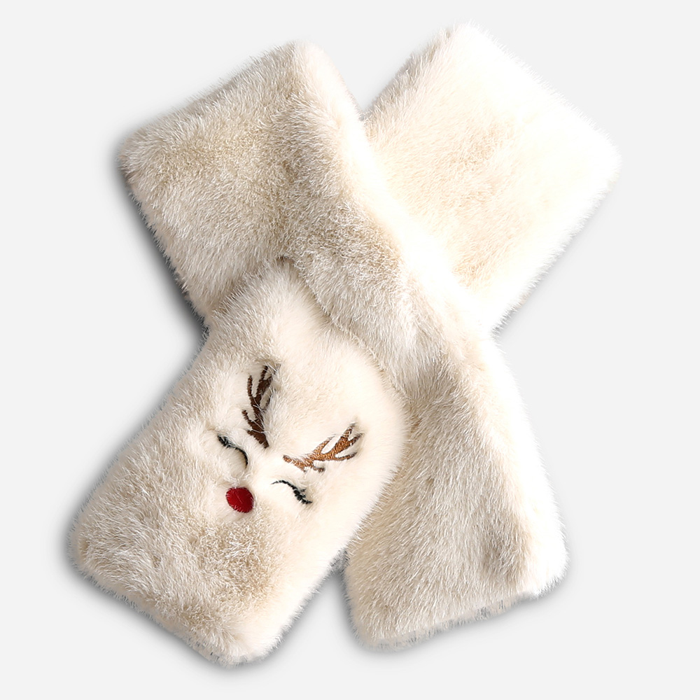 Faux Fur Plush Reindeer Embroidered Pull Through Scarf