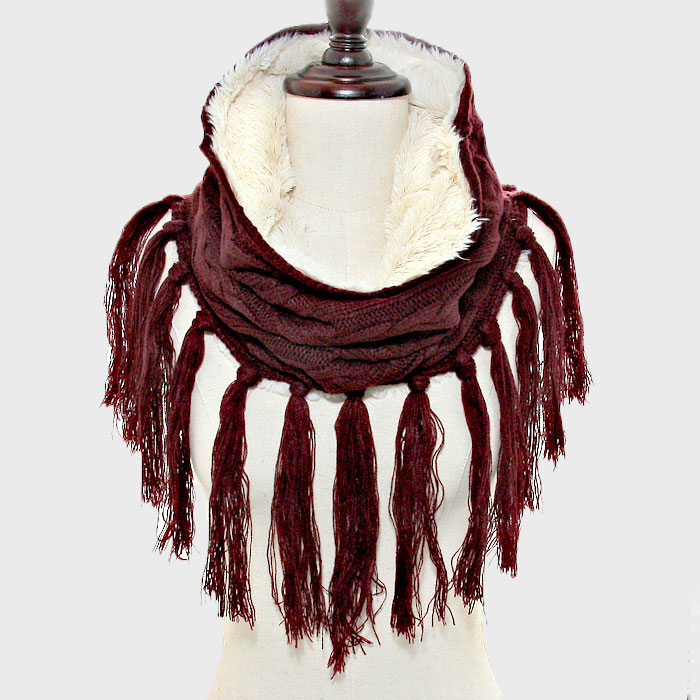 Fleece Lined Cable Knit Snood Scarf with Tassel