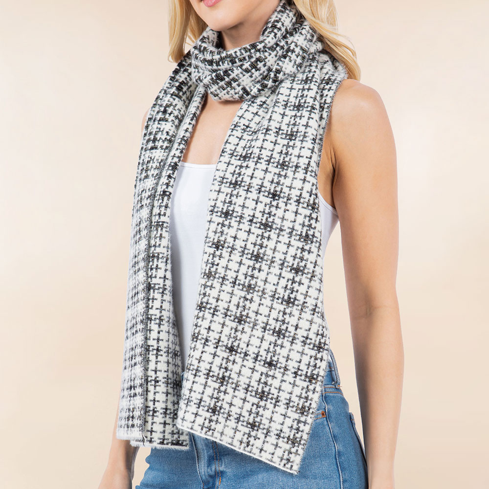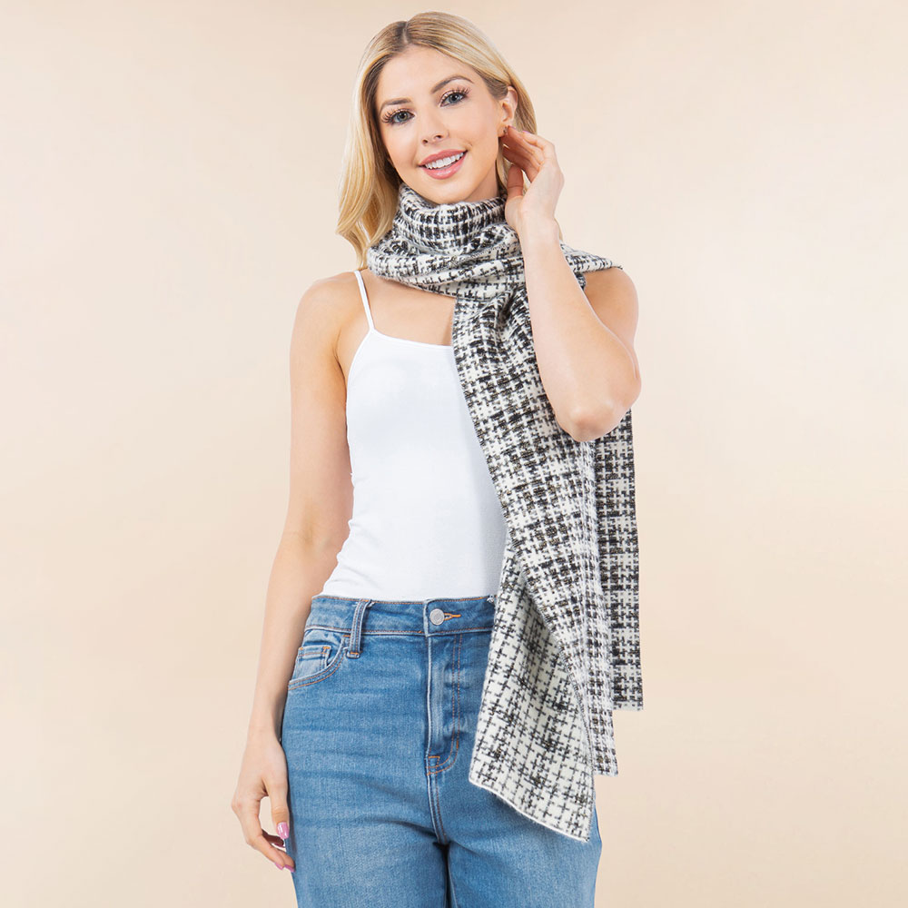 • Stay warm and chic with this elegant tweed scarf. Featuring a classic checkered pattern, this cozy winter accessory adds a sophisticated touch to any outfit. Ideal for layering on cold days.