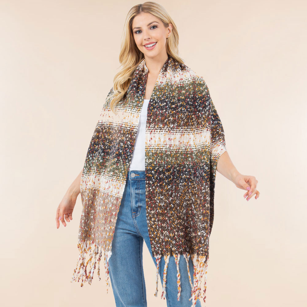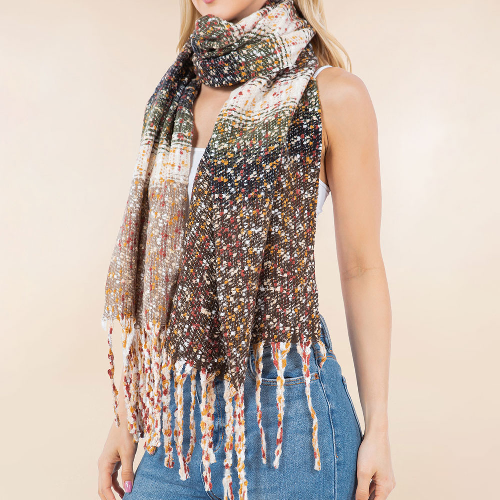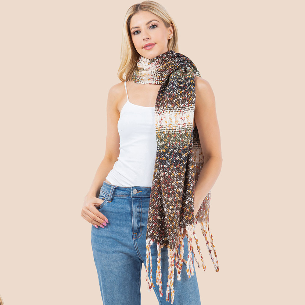 Details • Size : One Size • Material : 100% Acrylic • Elevate your outerwear with this woven scarf featuring a rich, multi-tonal texture and playful fringed hem. The oversized silhouette offers warmth and style for cool weather layering, while its artistic weave adds a distinctive touch to any casual or dressed-up ensemble.