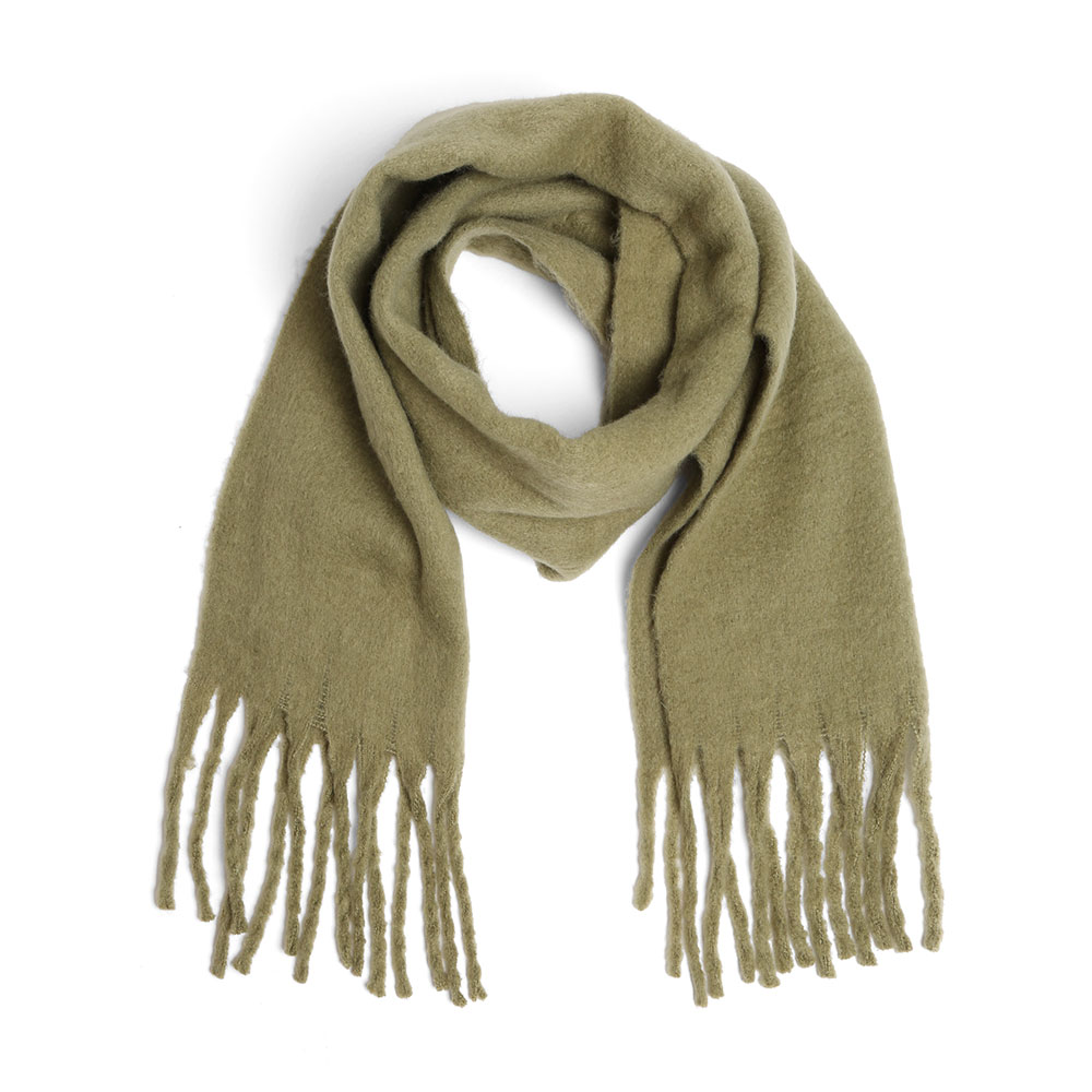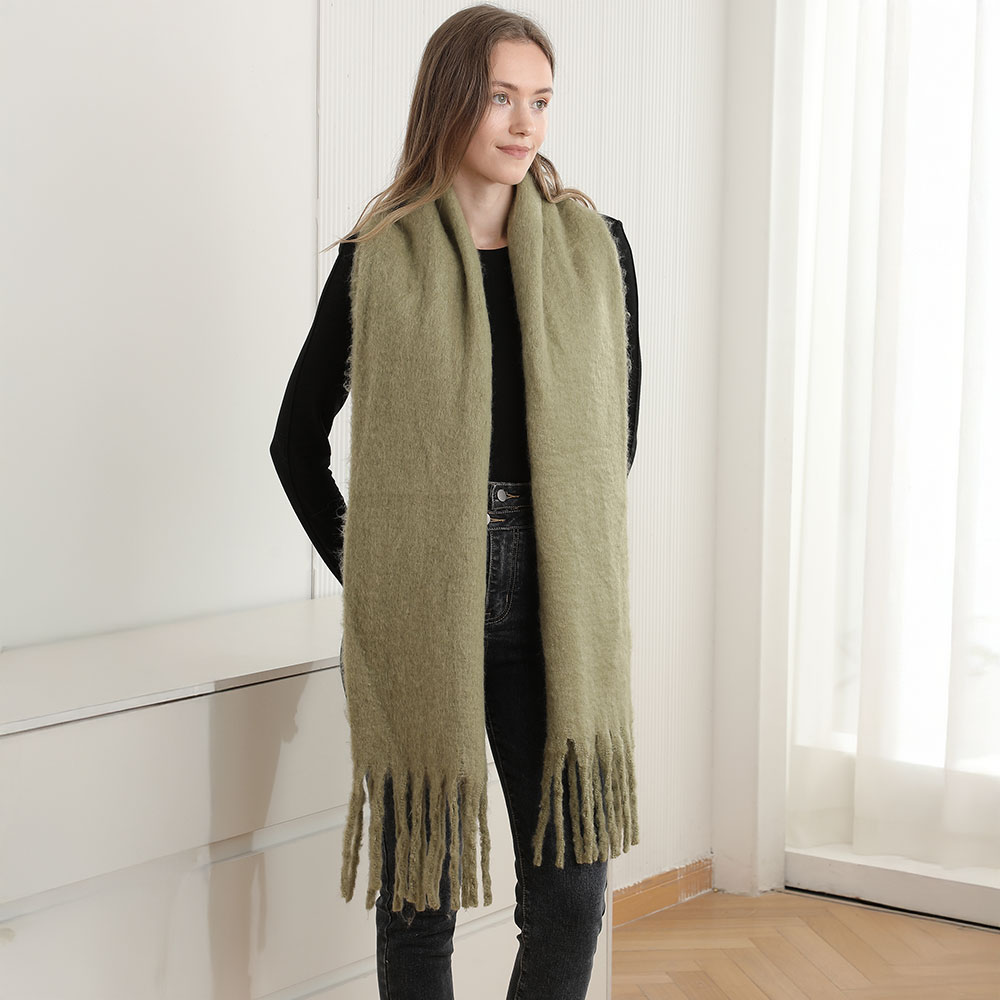 Details • Size : 76" X 15" • Fringe Size : 8" L • Material : 100% Acrylic • Oversized winter scarf featuring long fringed ends and a soft, cozy texture. Ideal for layering over sweaters or coats for added warmth and chic cold-weather style. Suitable for casual or dressy outfits.