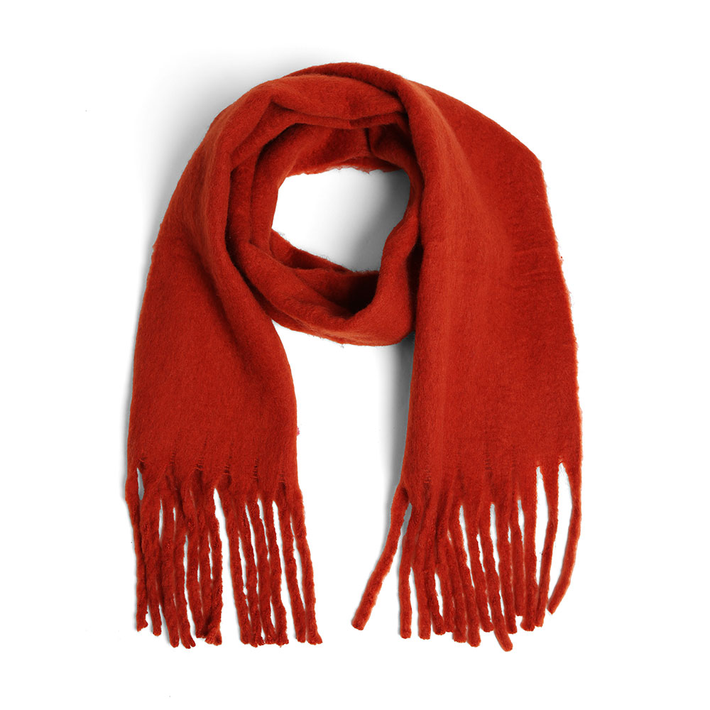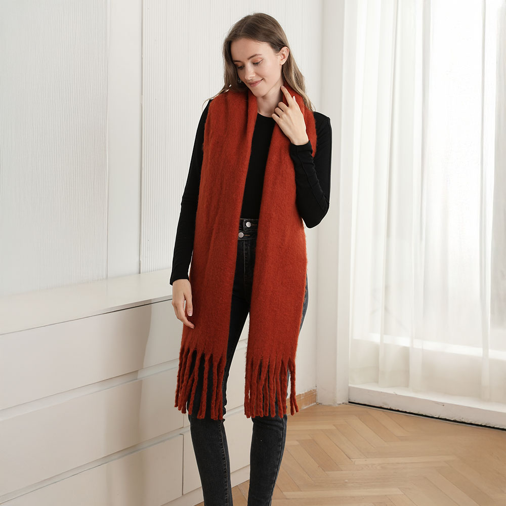 • Oversized winter scarf featuring long fringed ends and a soft, cozy texture. Ideal for layering over sweaters or coats for added warmth and chic cold-weather style. Suitable for casual or dressy outfits.