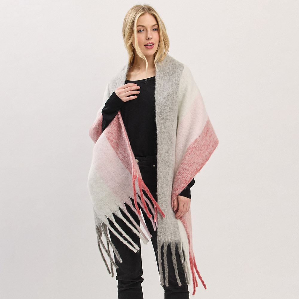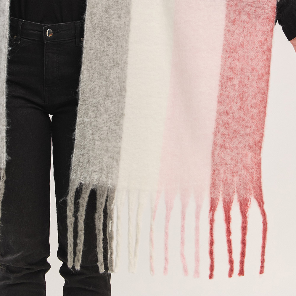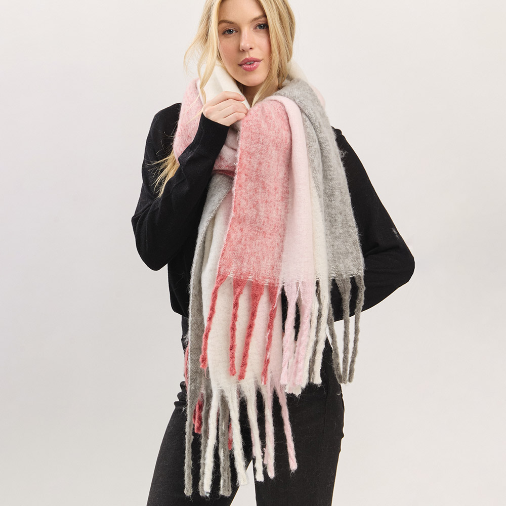 Details • Size : 74" X 17" • Material : 100% Polyester • Elevate your winter look with this soft brushed colorblock scarf, designed in an oversized silhouette for maximum comfort and warmth. Featuring long fringe ends and a cozy feel, it’s the perfect cold-weather essential to drape over your favorite layered outfits.