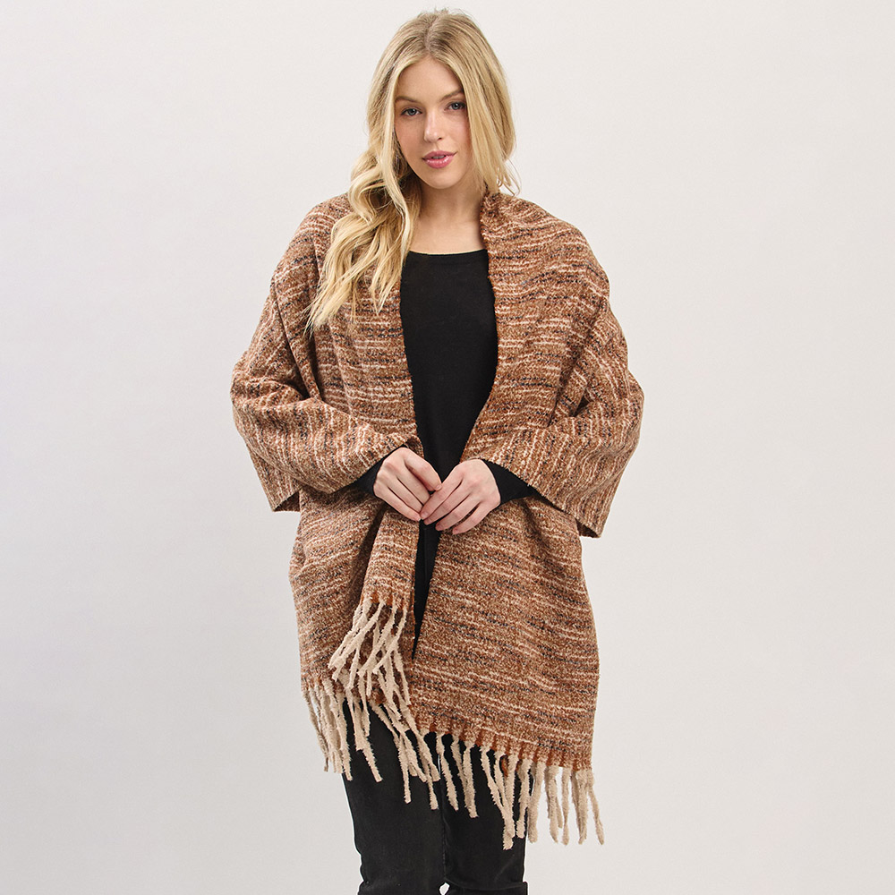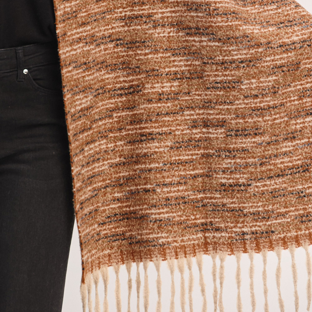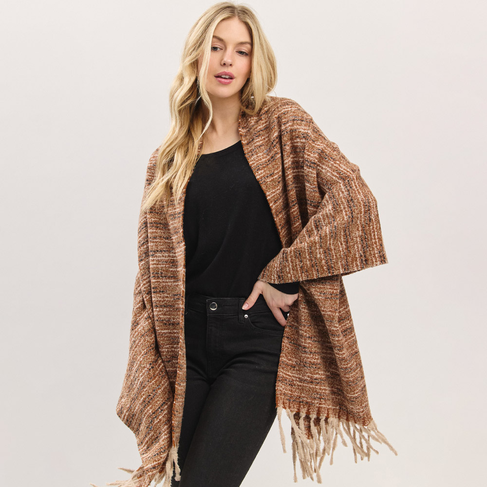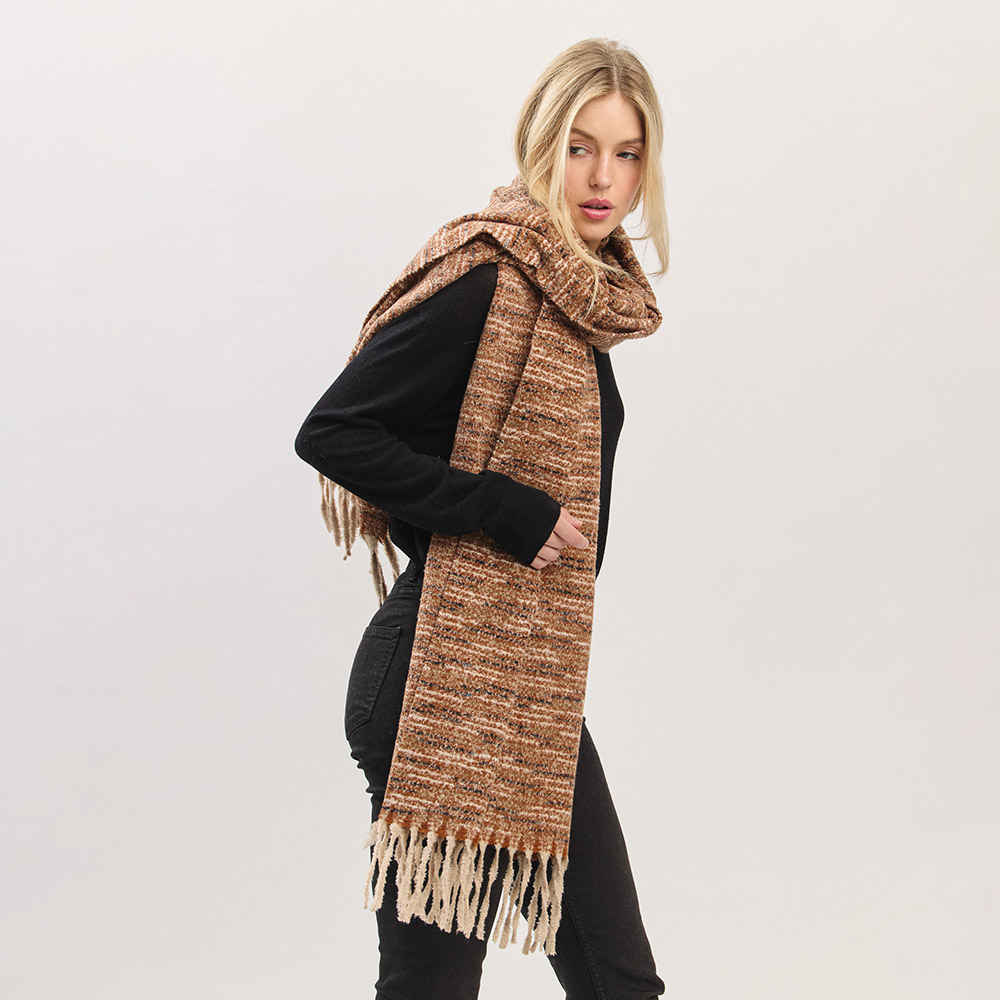 Details • Size : 73" X 22.5" • Material : 100% Polyester • Stay warm and stylish with this oversized striped scarf wrap featuring a soft texture and tassel fringe detailing. Its versatile size allows for cozy layering as a shawl or scarf, making it a go-to accessory for chilly days and effortless transitional outfits.