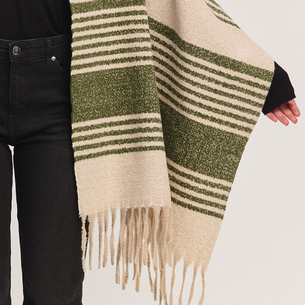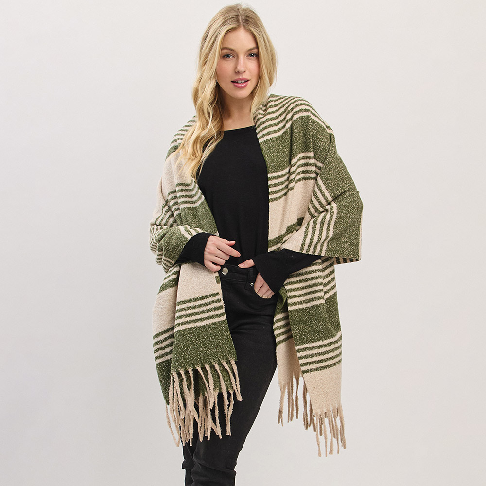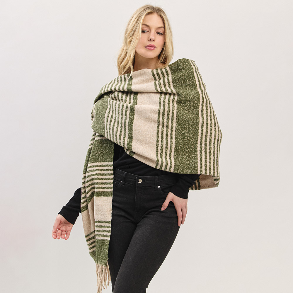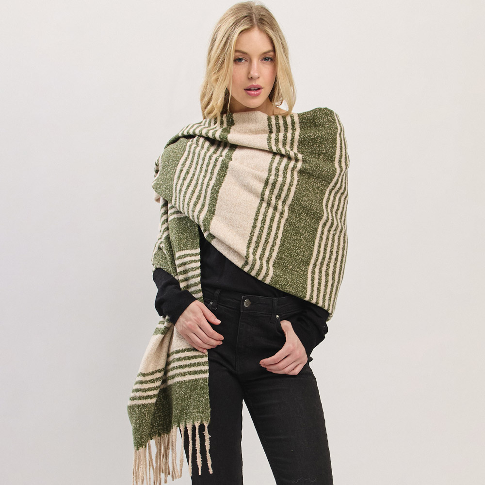 Details • Size : 73" X 22.5" • Material : 100% Polyester • Elevate your cold-weather wardrobe with this striped fringe blanket scarf. The oversized design offers warmth and effortless style, while the soft, neutral-toned stripes and tassel edges bring a cozy, timeless appeal perfect for layering all season long.