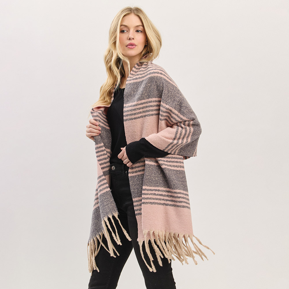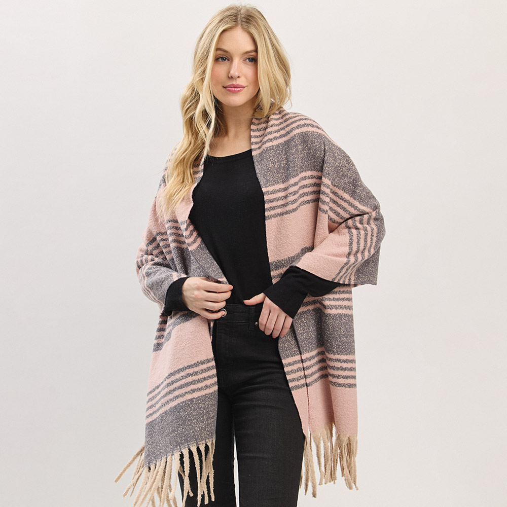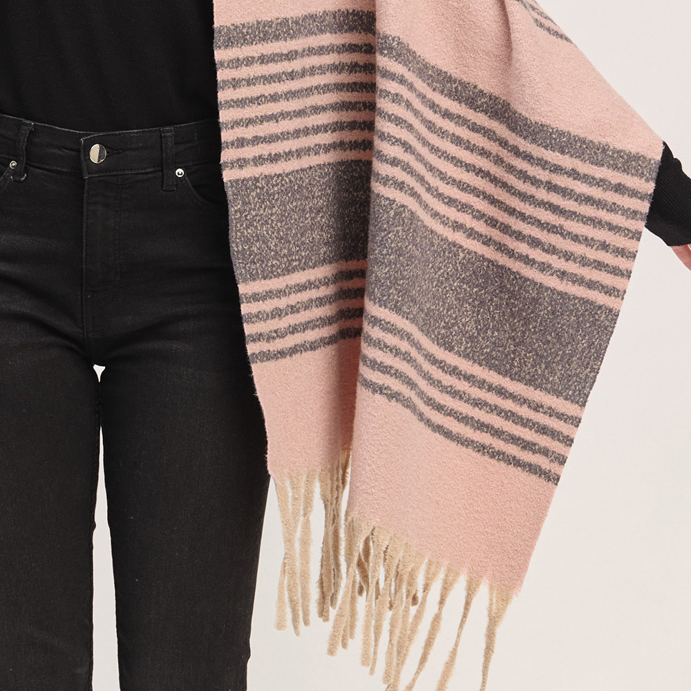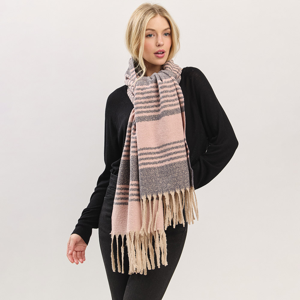 Details • Size : 73" X 22.5" • Material : 100% Polyester • Elevate your cold-weather wardrobe with this striped fringe blanket scarf. The oversized design offers warmth and effortless style, while the soft, neutral-toned stripes and tassel edges bring a cozy, timeless appeal perfect for layering all season long.
