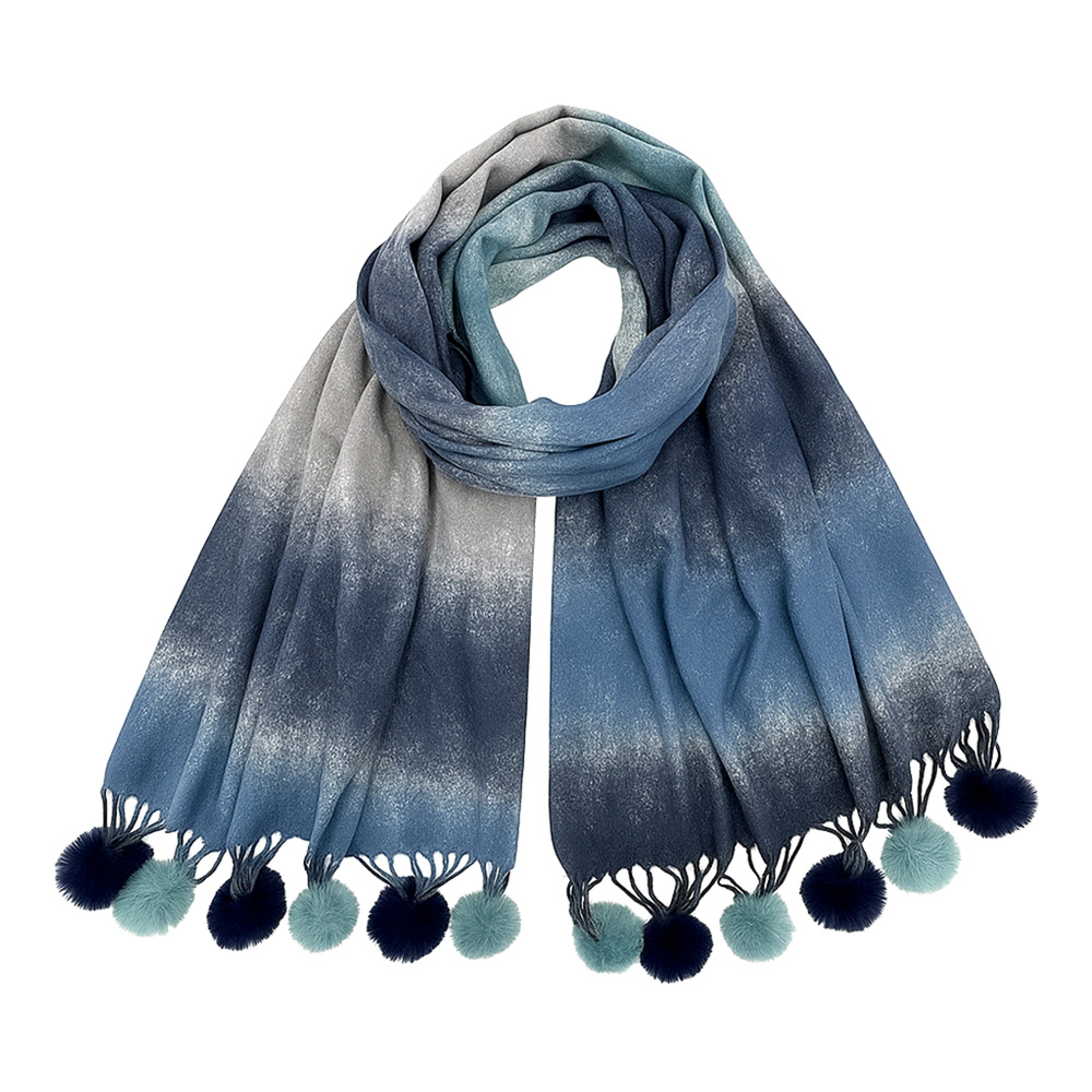 • Soft gradient scarf featuring playful pom-pom tassels, designed to bring warmth and a chic accent to any look. Perfect as a versatile wrap for layering, it adds comfort and style to casual or dressy outfits.