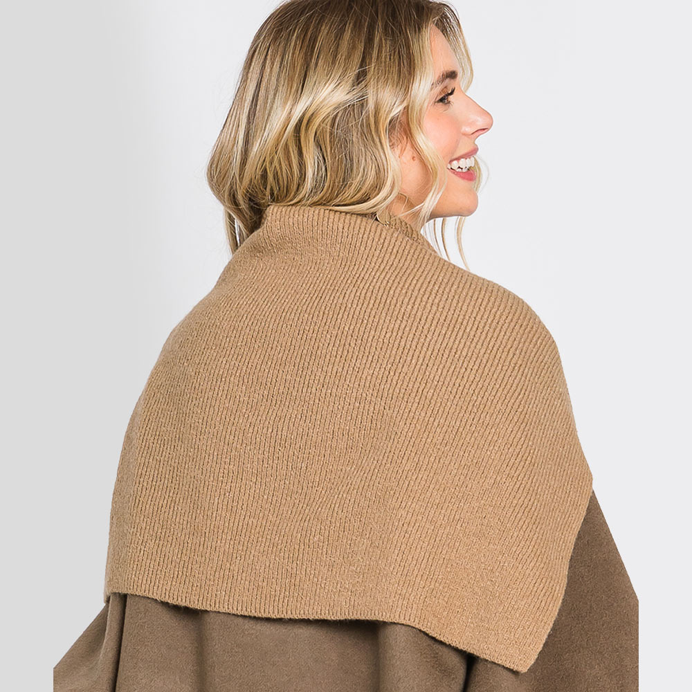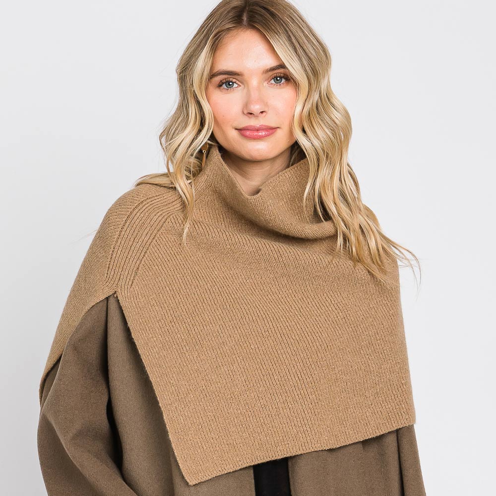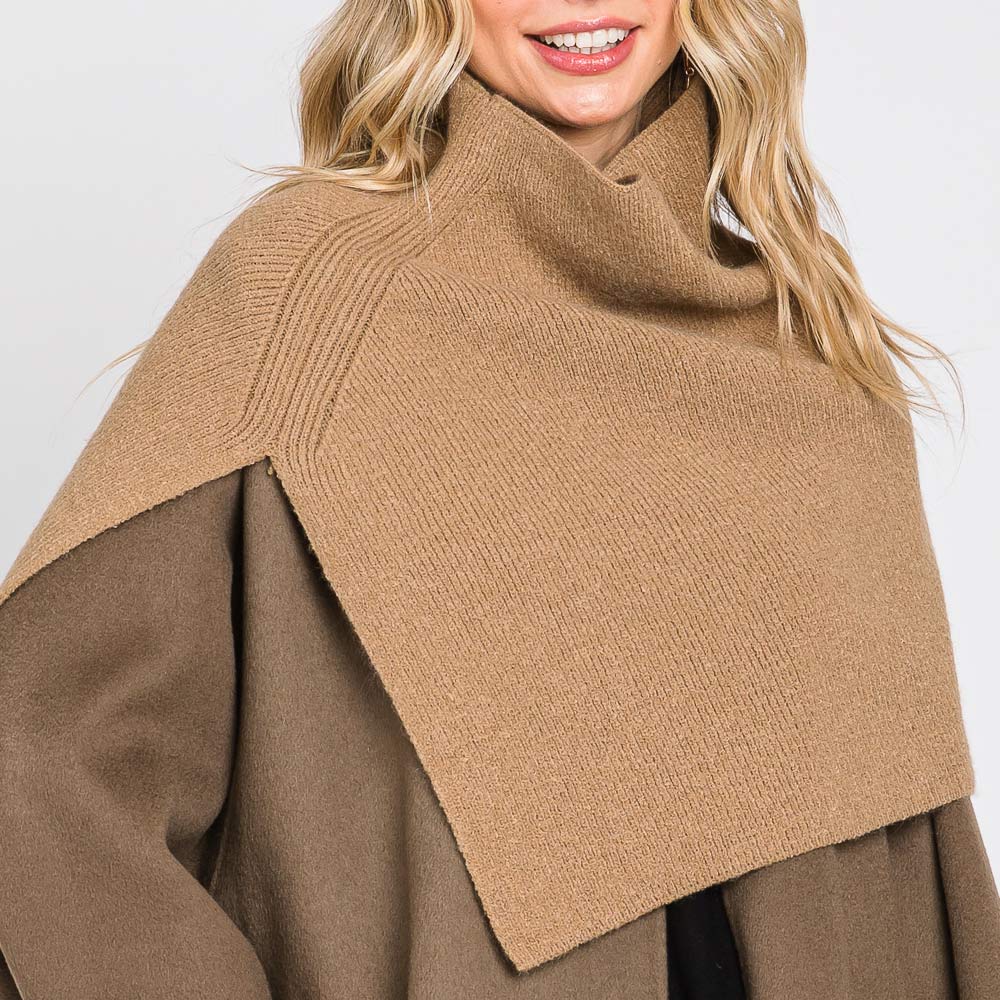 Details • Size : 19.25" X 19" • Material : 50% Acrylic, 28% Polyester, 22% Spandex • Chic asymmetrical knit turtleneck shoulder wrap offering cozy warmth and modern elegance. Perfect for layering over coats or sweaters, this stylish piece adds texture and sophistication to your outfit, making it an effortless statement accessory for cool-weather looks.