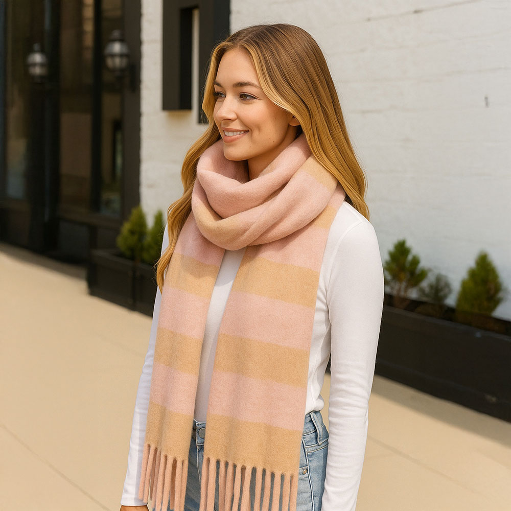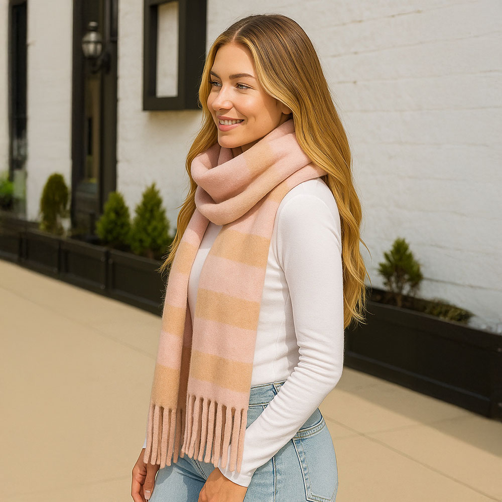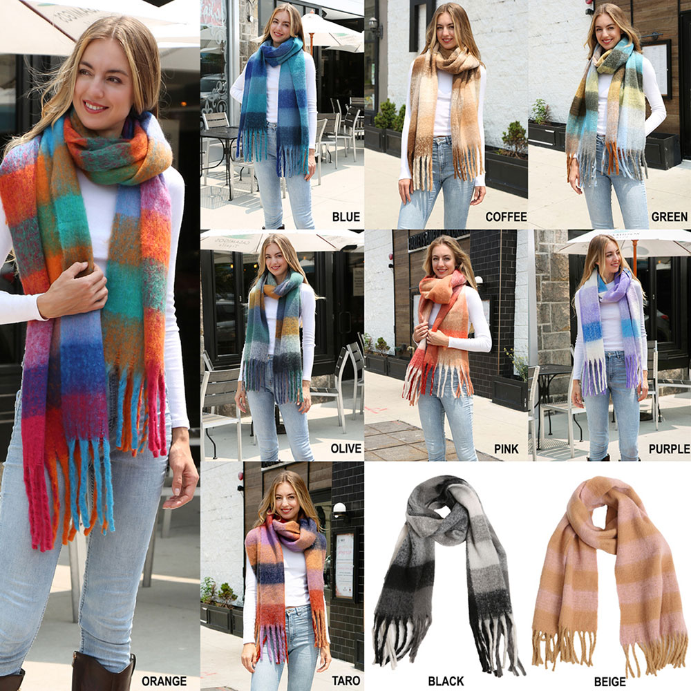 Details • Size : 81" X 15" • Fringe Size : 8" H • Material : 100% Acrylic • Long plaid scarf featuring a soft, cozy texture and playful fringe ends. Designed for warmth and style, it’s the perfect cold-weather accessory to layer over casual or dressy outfits, adding comfort and a touch of charm to any look.