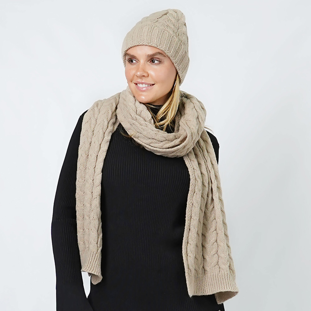 Details • Scarf Size : 13" X 74.5" • Hat Size : One Size • Material : 100% Polyester • Stay warm with this cable knit scarf and matching hat set designed for both comfort and style. Perfect for everyday wear, casual outings, or travel, this cozy winter accessory set adds timeless charm and soft warmth to your cold-weather wardrobe.