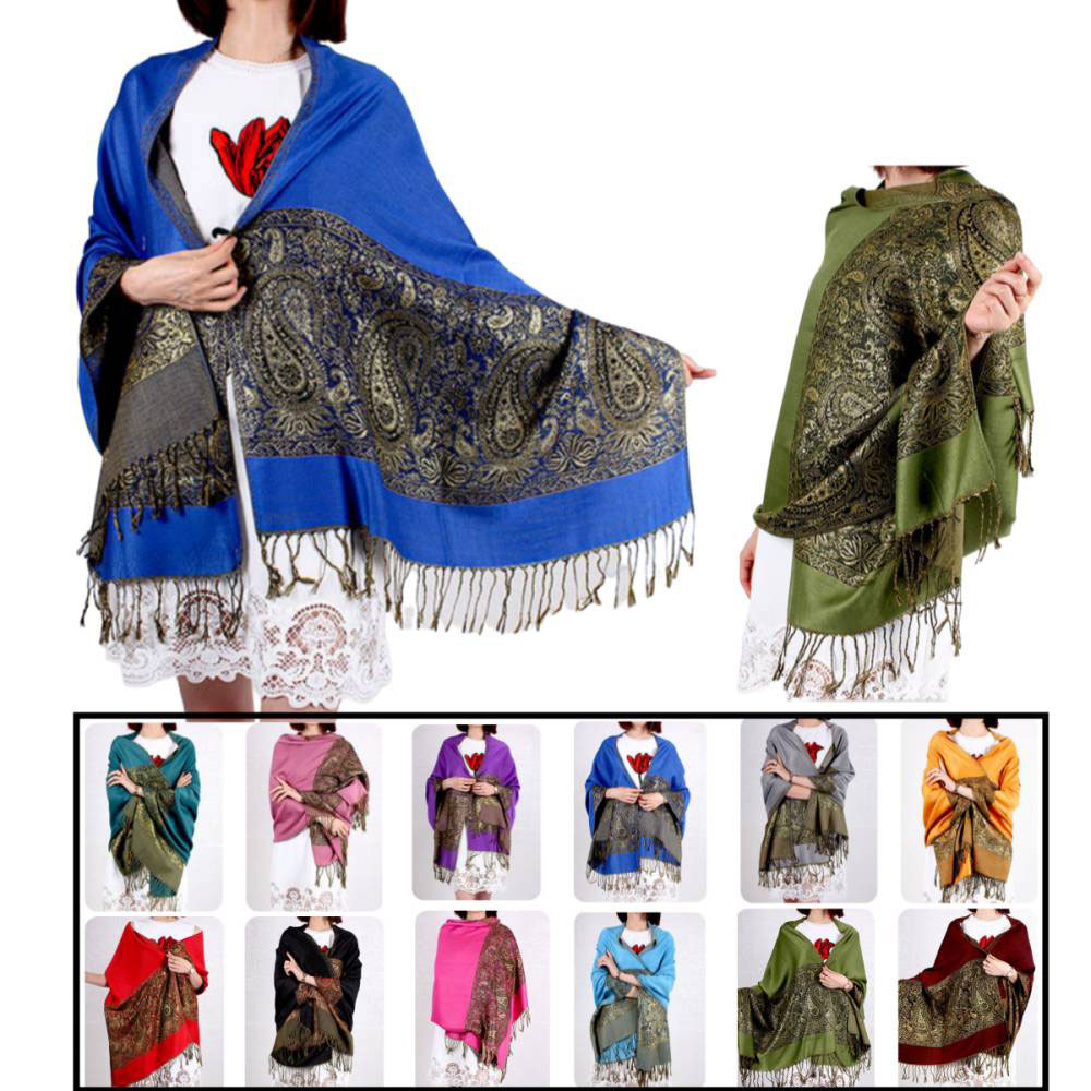 Details • Size : 28" X 78" • Material : 100% Pashmina • Elegant paisley shawl wrap with fringed edges, available in assorted styles for versatile wear. Perfect as a scarf, wrap, or cover-up, this timeless accessory enhances both casual and formal looks. Lightweight and stylish, it makes an excellent addition to wardrobes for year-round layering.