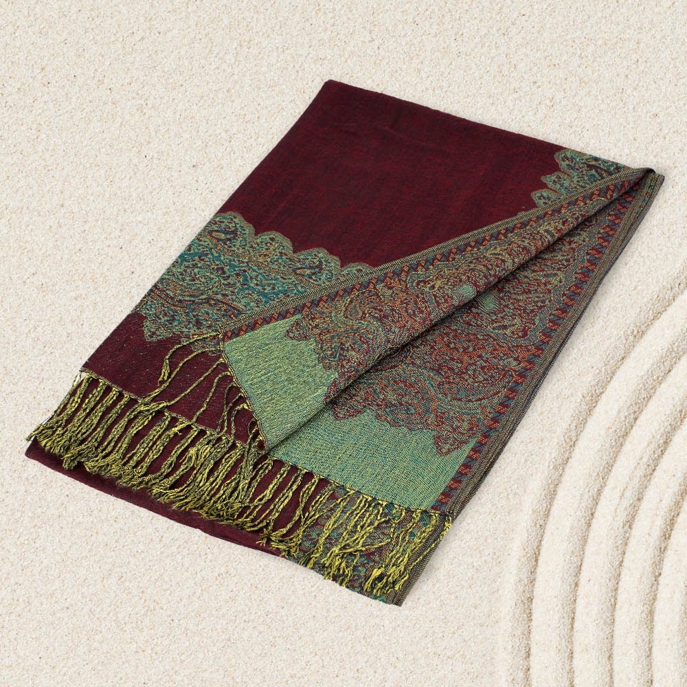 • This reversible shawl showcases a graceful floral border and complementary tones on each side. Designed with soft drape and fringe ends, it's a versatile accessory for both casual and refined ensembles.