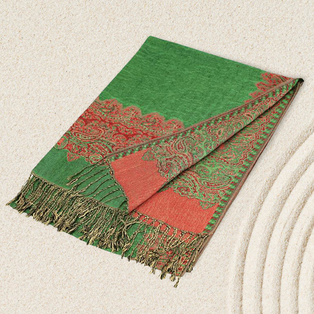 • This reversible shawl showcases a graceful floral border and complementary tones on each side. Designed with soft drape and fringe ends, it's a versatile accessory for both casual and refined ensembles.