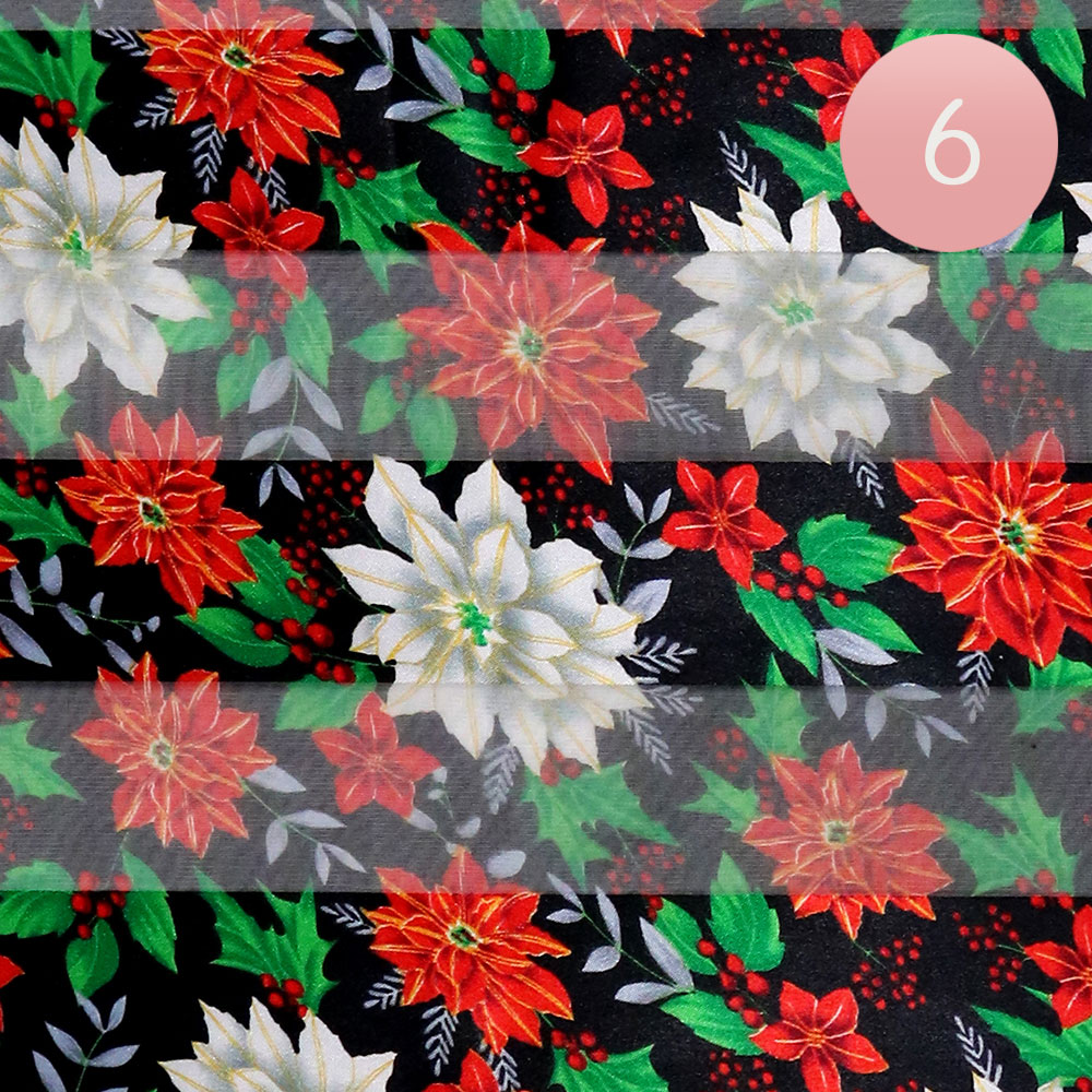 Details • Size : 13" X 60" • Material : 100% Polyester • Set of 6 sheer scarves with festive floral and leaf patterns. Lightweight and stylish, perfect for seasonal accessorizing or gifting. Ideal for adding a cheerful accent to everyday and holiday outfits.