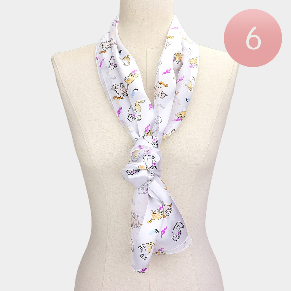 6PCS - Silk Feel Satin Striped Cat Print scarf