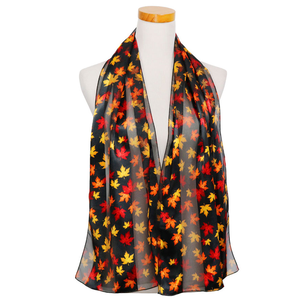 Details • Size : 13" X 60" • Material : 100% Polyester • Celebrate the season with these lightweight sheer scarves featuring vibrant red, orange, and yellow maple leaf prints. Perfect for layering or gifting, this 6-piece set makes a festive addition to fall boutique displays and Thanksgiving collections. • Made In Korea