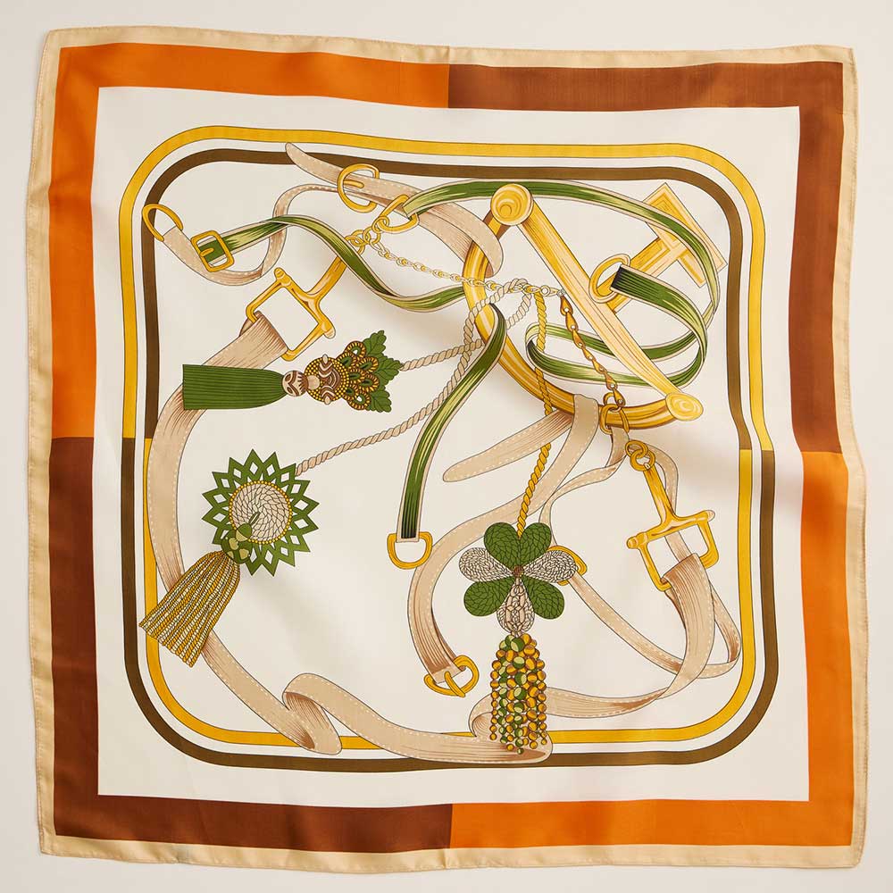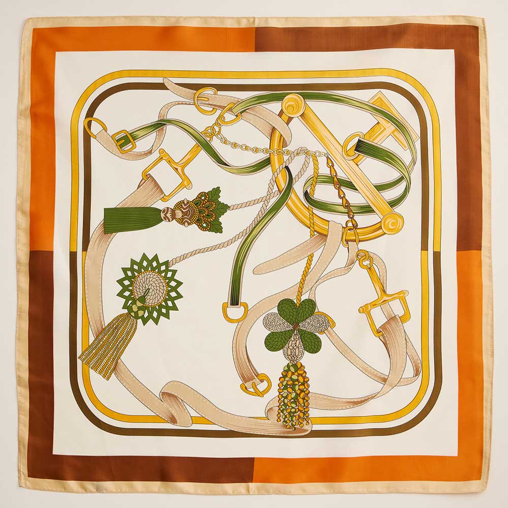 Equestrian Inspired Tassel and Buckle Printed Square Silky Satin Scarf