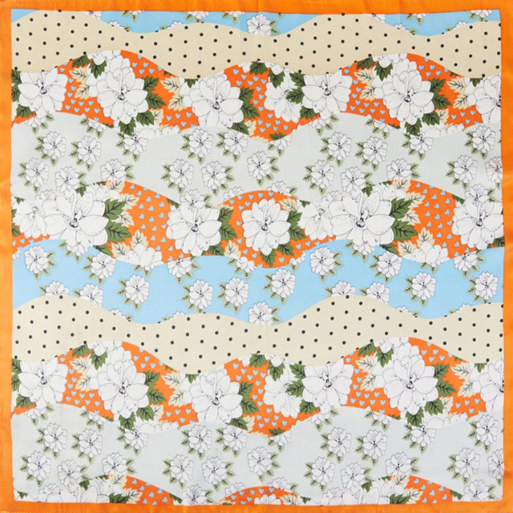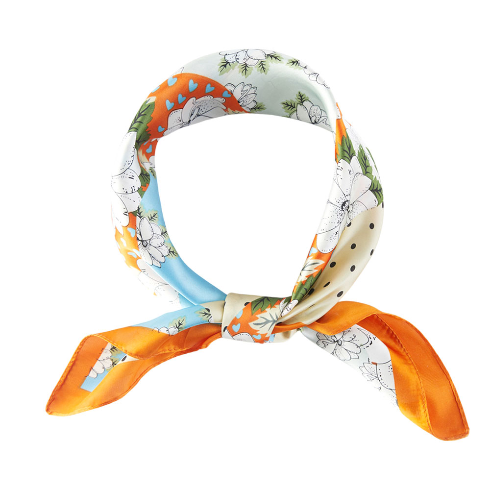 Details • Size : 27.5" X 27.5" • Material : 100% Polyester • This square scarf showcases a charming patchwork of floral motifs and playful dotted accents, offering a soft, artistic look. Lightweight and versatile, it adds a refined touch to everyday outfits, perfect for styling around the neck, hair, or as an accessory on bags.