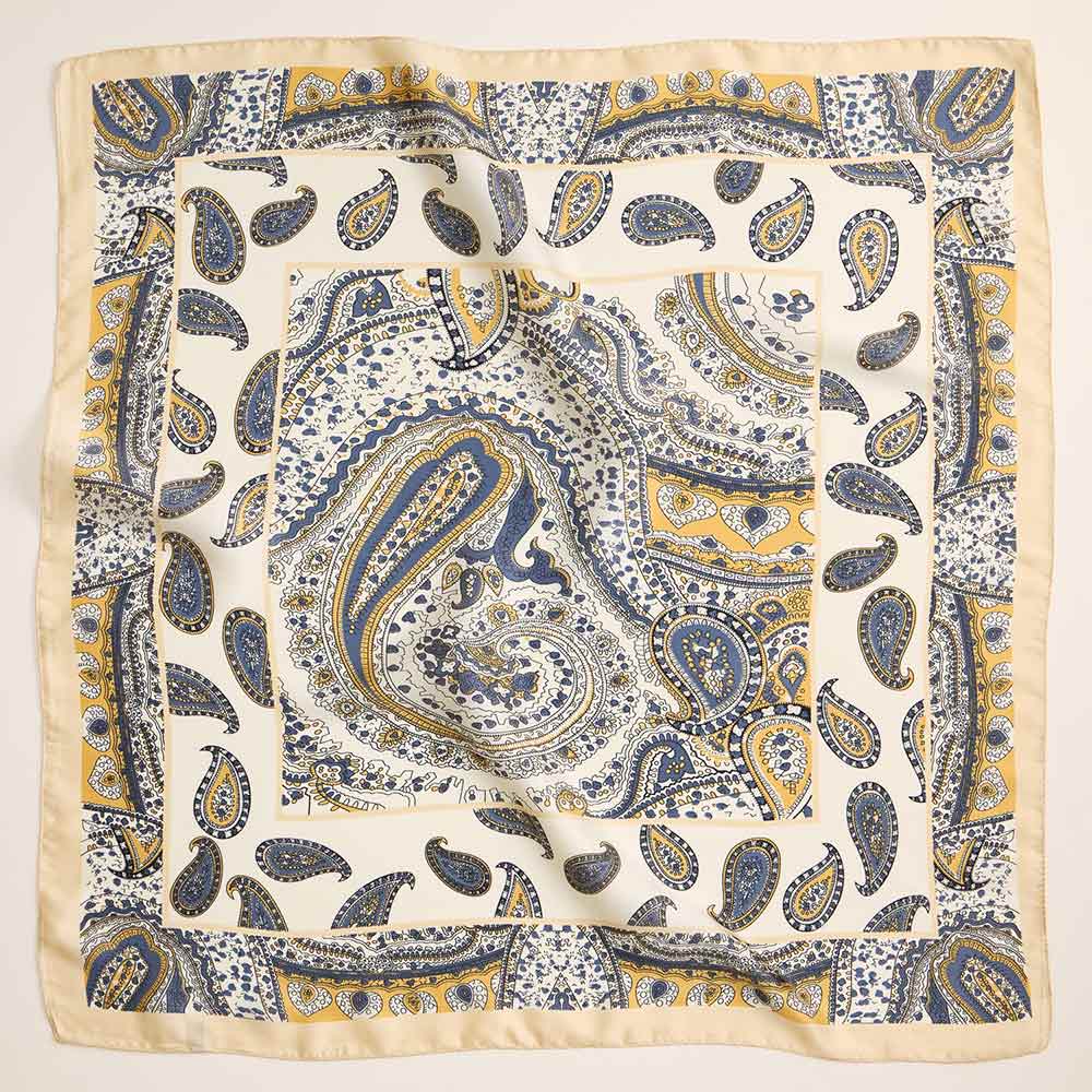 • Add timeless charm to your look with this square scarf featuring a classic paisley motif and detailed border. Ideal for versatile styling in any season.