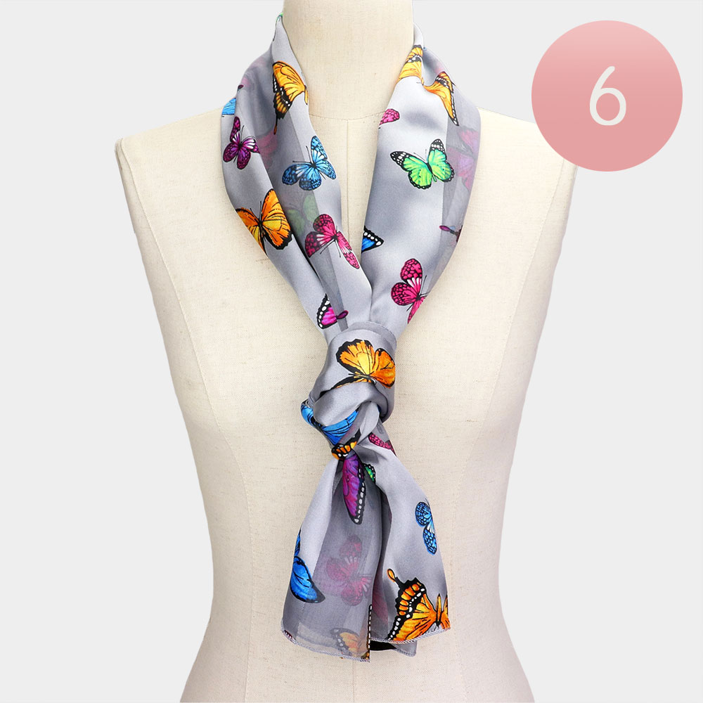 6PCS - Silk Feel Satin Butterfly Patterned Scarves