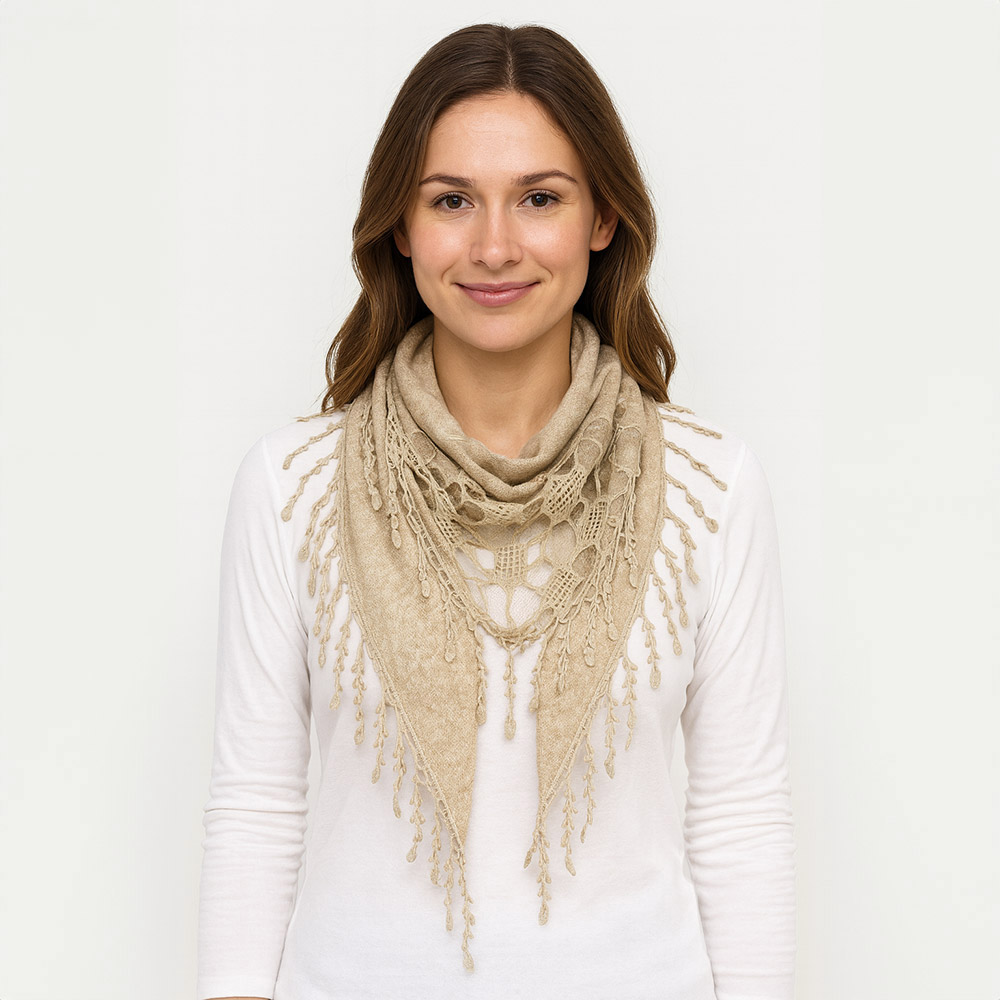 • This chic triangular scarf is adorned with intricate fringe detailing that adds movement and charm to any look. Lightweight yet stylish, it’s perfect for layering across seasons, offering versatile wear as a neck accessory, shoulder wrap, or statement accent.