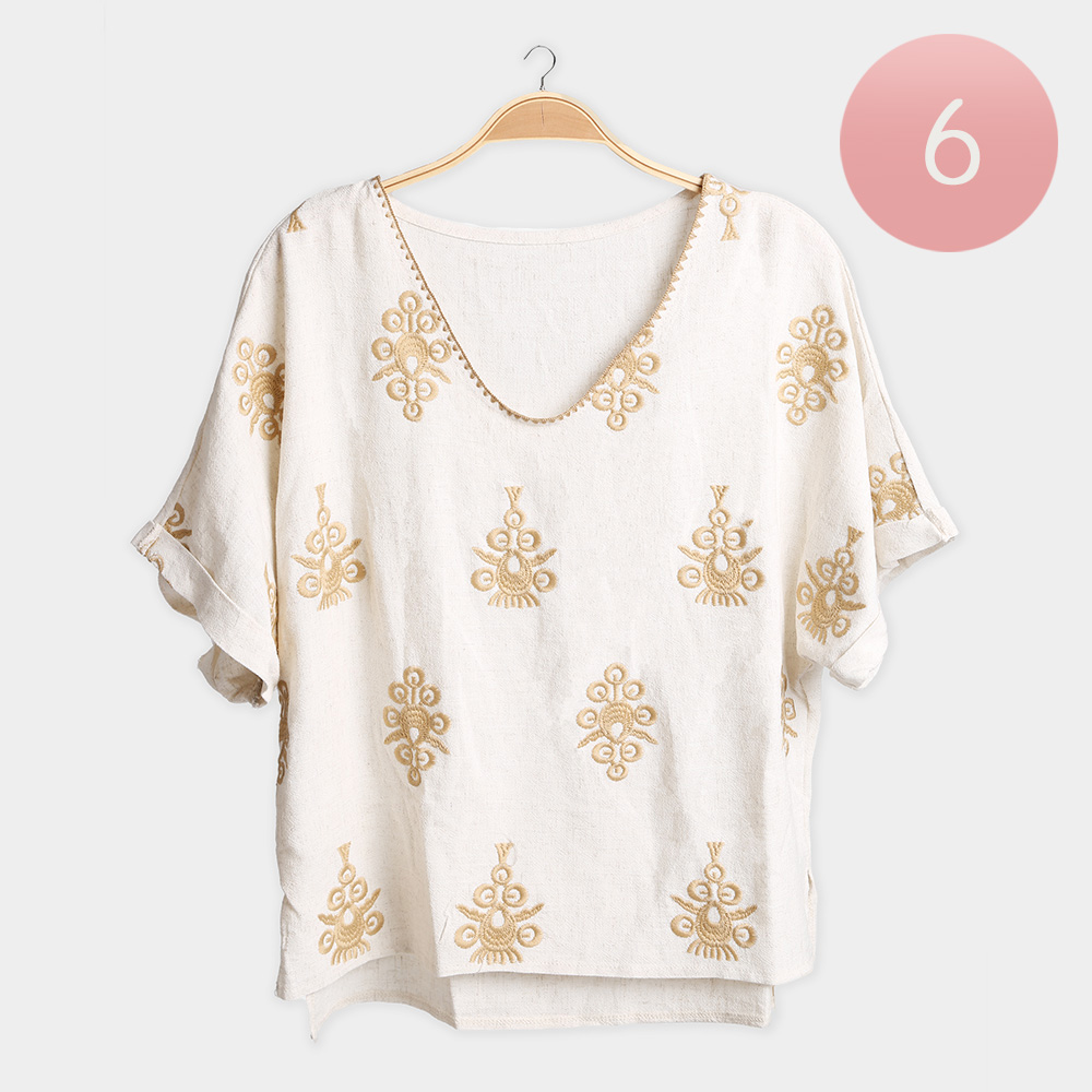 6PCS - Boho Embroidered Linen V-neck Short Sleeves Top