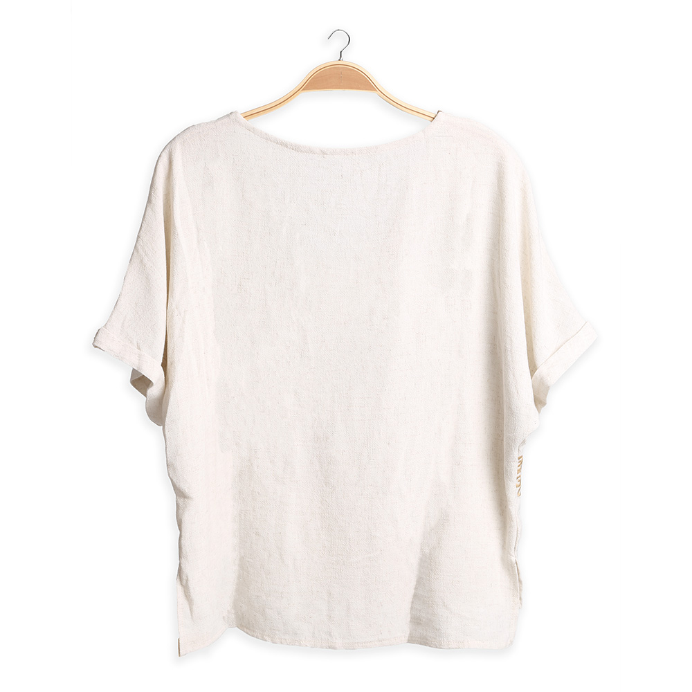 • Elegant beige embroidered linen-cotton blend blouse with short sleeves and intricate golden patterns. A breathable, stylish top perfect for spring and summer casual or boho-chic looks.