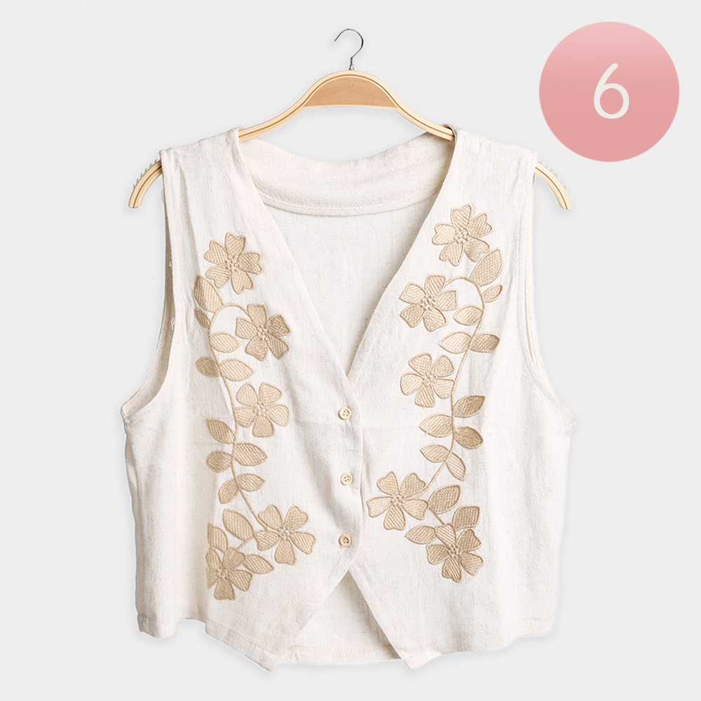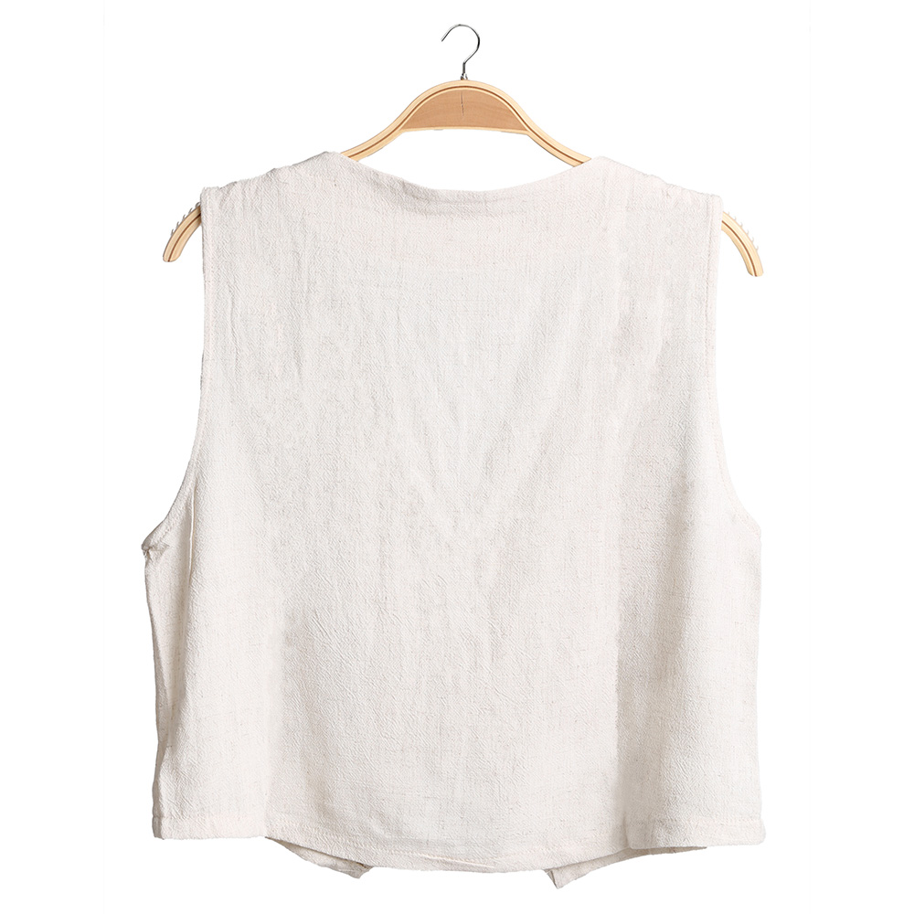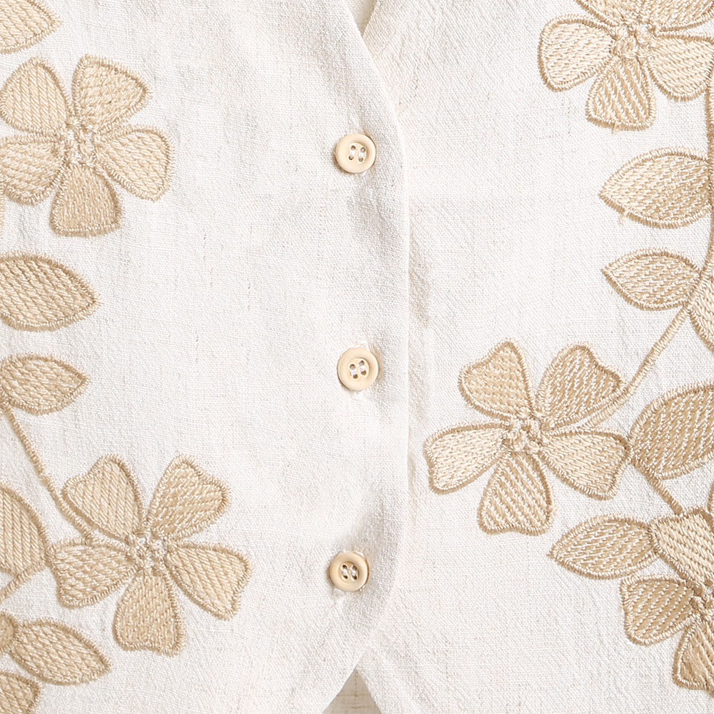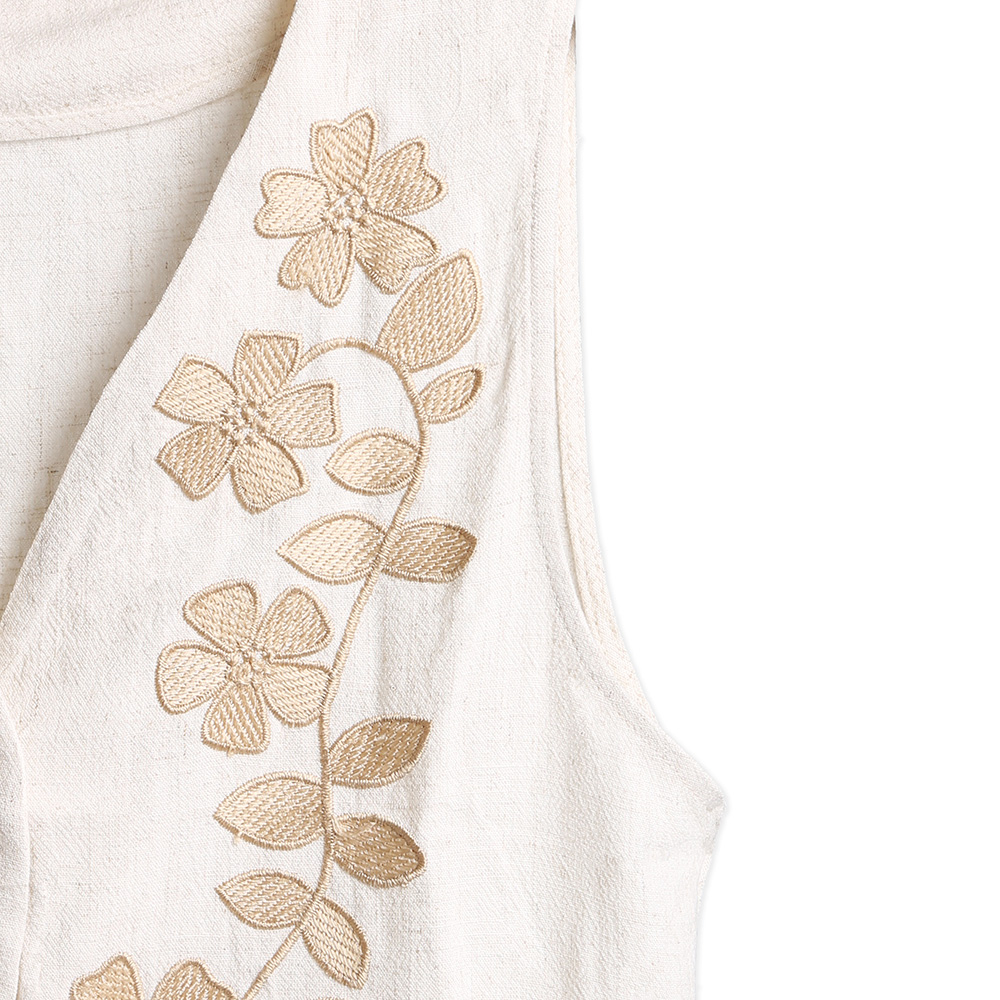 Details • Size : S/M, M/L • Material : 70% Linen, 30% Cotton • Charming beige sleeveless vest top for women featuring delicate floral embroidery and button-down front. Made from a breathable linen-cotton blend, ideal for layering or warm-weather styling.