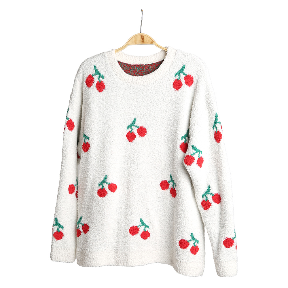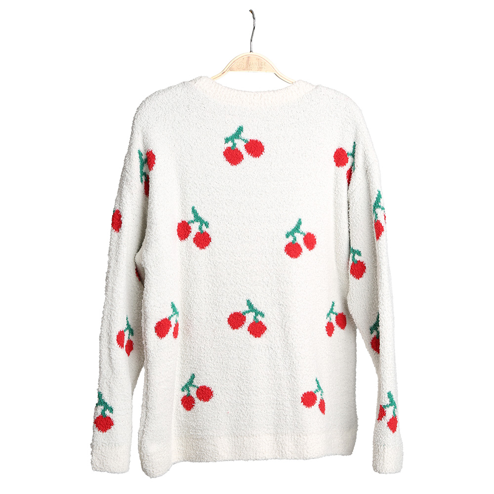 Details • Size : One Size • Material : 100% Poly.Microfiber • Add a playful twist to your loungewear with this cherry pattern knit pullover. Designed with a relaxed fit, soft textured fabric, and cheerful allover motif, it offers both comfort and charm—perfect for layering, lounging, or brightening up everyday casual looks.
