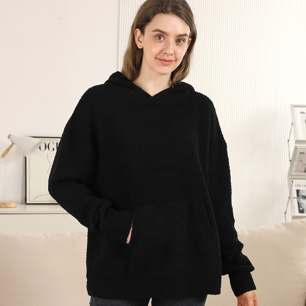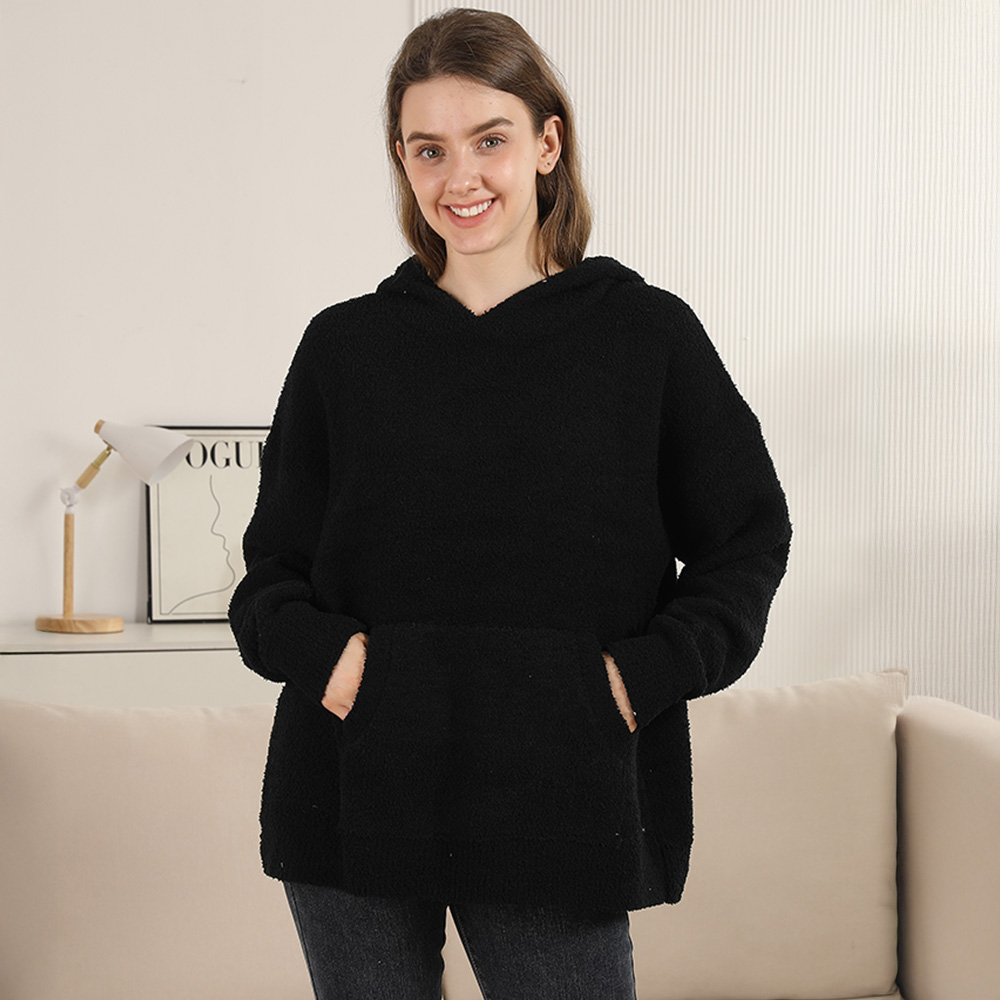 • Stay comfortable in this oversized hooded pullover featuring a relaxed fit and front pocket for added practicality. Designed with a plush texture and casual silhouette, it’s a versatile piece perfect for layering or wearing on its own during cooler days.