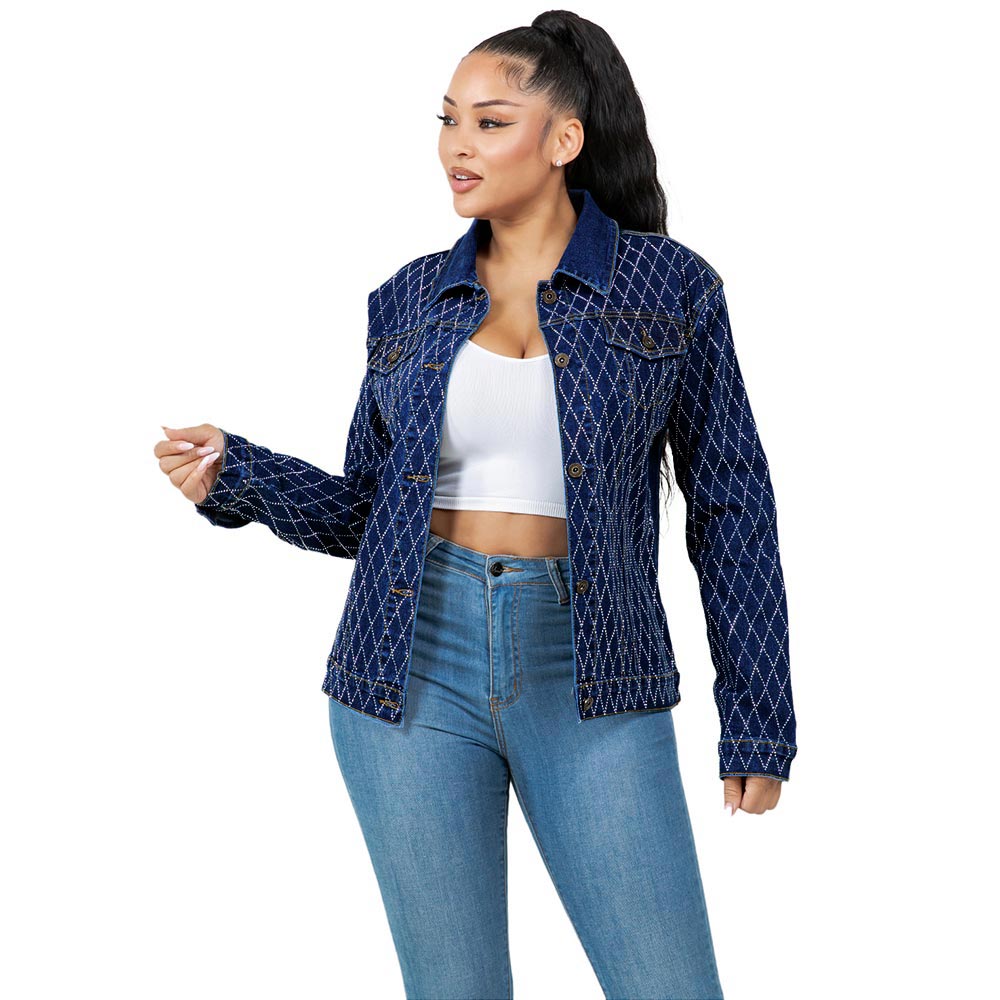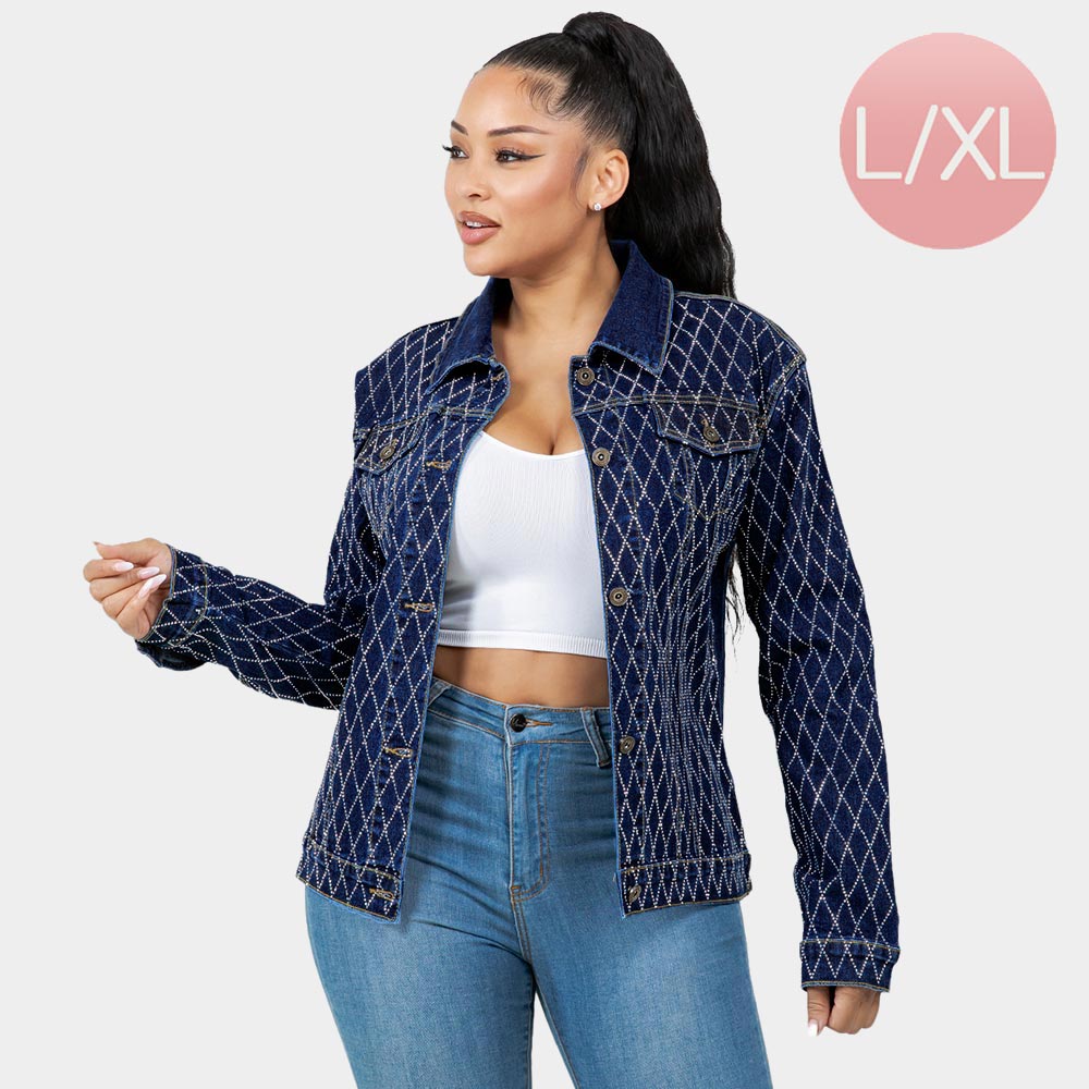 Details • Size : L/XL • Material : 67% Cotton, 20% Polyester, 11% Rayon, 2% Spandex • Step out in style with this eye-catching rhinestone studded denim jacket featuring a classic button-up design. Perfect for casual outings or elevated streetwear looks, it combines sparkle and structure in one chic piece. It's perfect for both day and night. Features functional front pockets, full-length sleeves, and a flattering tailored fit that pairs effortlessly with jeans or leggings.