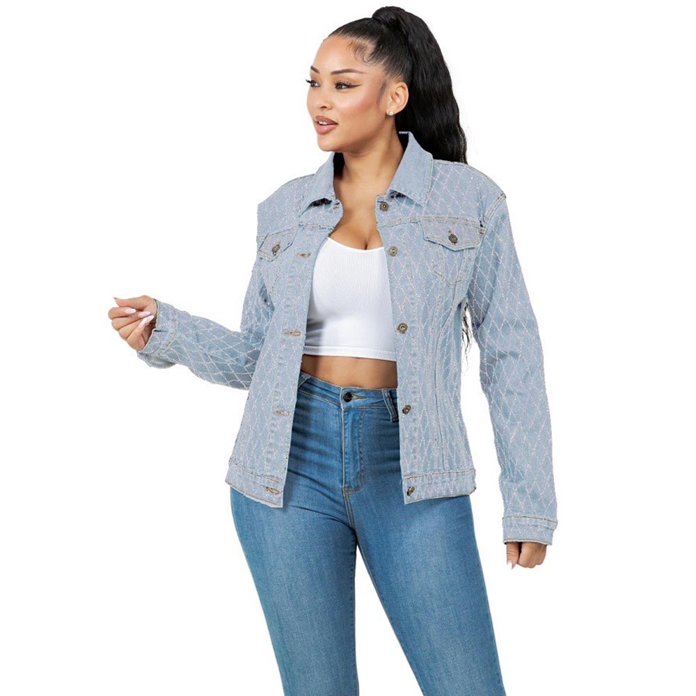 Details • Size : 2XL/3XL • Material : 67% Cotton, 20% Polyester, 11% Rayon, 2% Spandex • Step out in style with this eye-catching rhinestone studded denim jacket featuring a classic button-up design. Perfect for casual outings or elevated streetwear looks, it combines sparkle and structure in one chic piece. It's perfect for both day and night. Features functional front pockets, full-length sleeves, and a flattering tailored fit that pairs effortlessly with jeans or leggings.