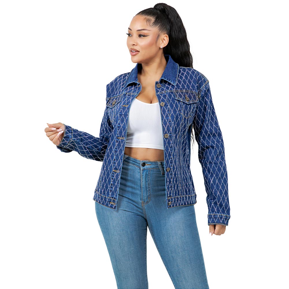 Details • Size : 4XL • Material : 67% Cotton, 20% Polyester, 11% Rayon, 2% Spandex • Step out in style with this eye-catching rhinestone studded denim jacket featuring a classic button-up design. Perfect for casual outings or elevated streetwear looks, it combines sparkle and structure in one chic piece. It's perfect for both day and night. Features functional front pockets, full-length sleeves, and a flattering tailored fit that pairs effortlessly with jeans or leggings.